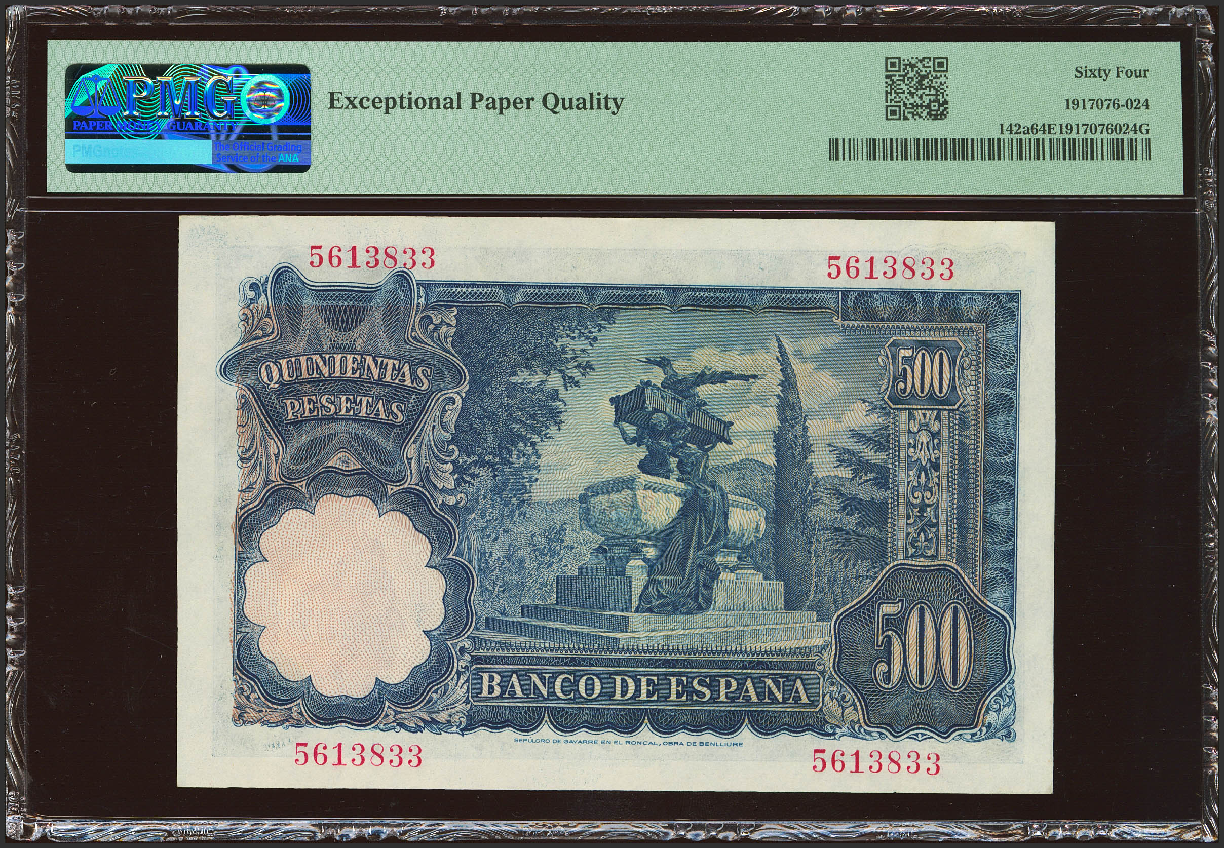500 Pesetas. 15 de Noviembre de 1951. Sin serie. (Edifil 2023: 460, Pick: 142). Inusual, apresto original. SC. Encapsulado PMG64EPQ.