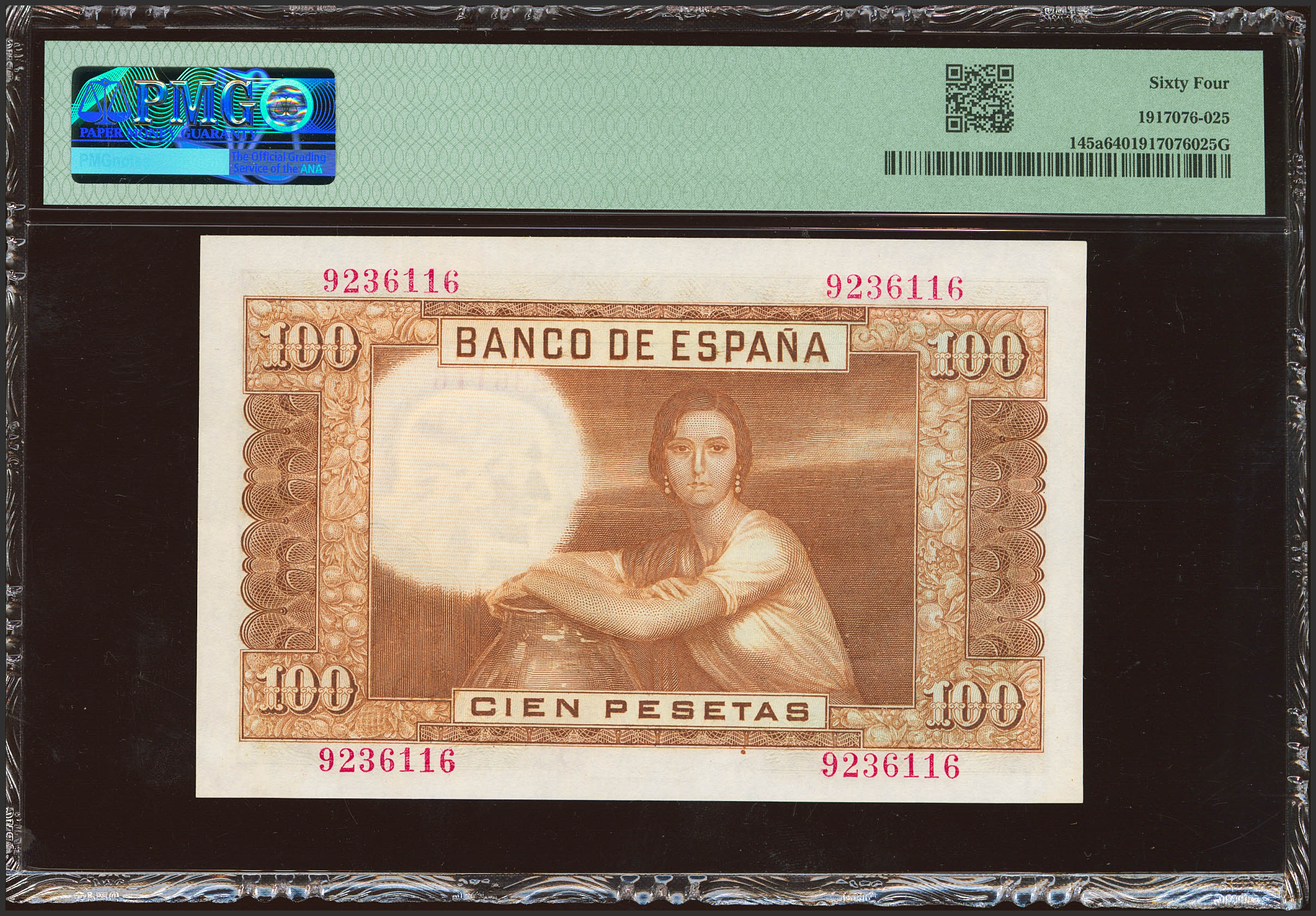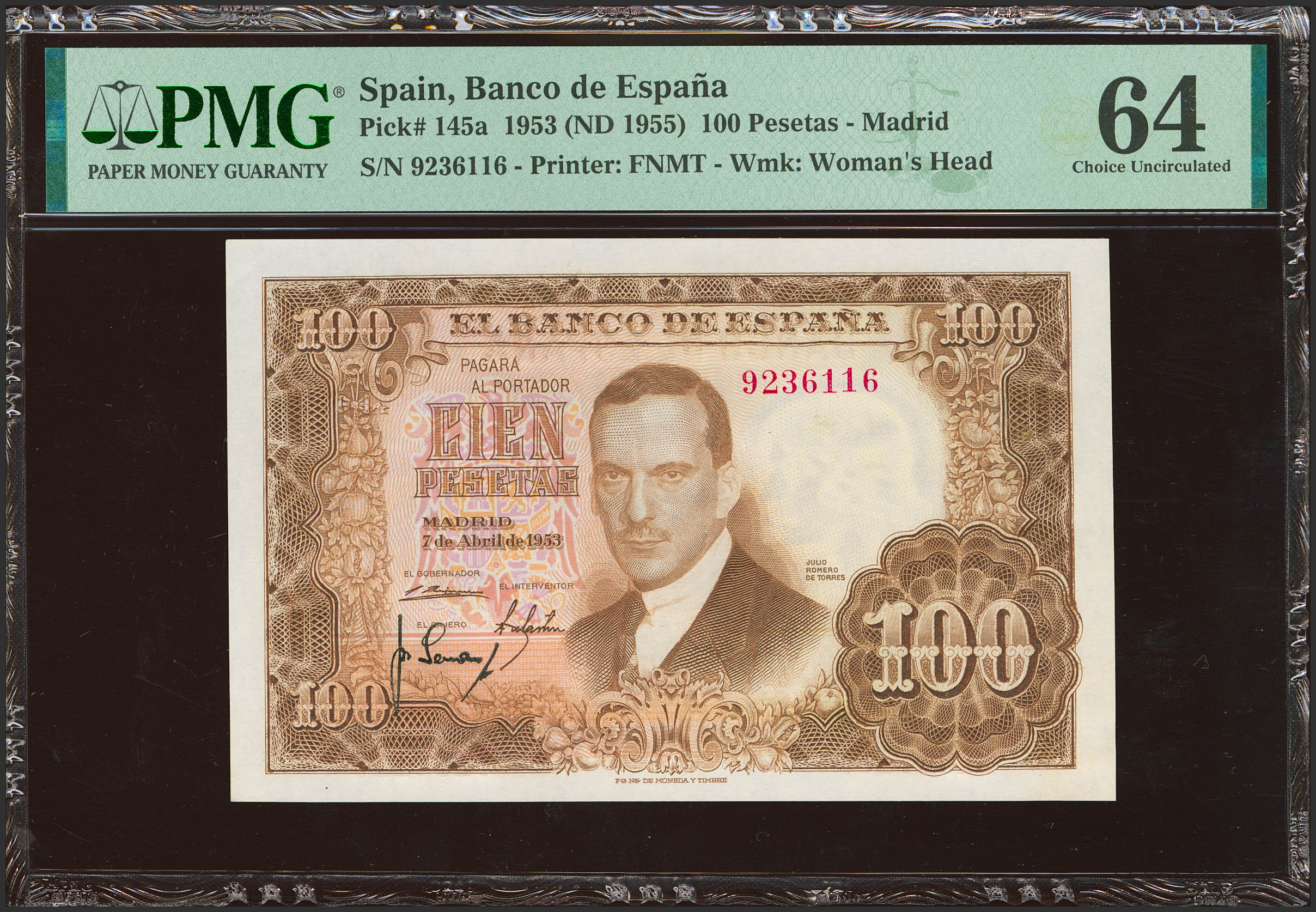 100 Pesetas. 7 de Abril de 1953. Sin serie. (Edifil 2023: 464, Pick: 145a). Raro en esta calidad. SC. Encapsulado PMG64.