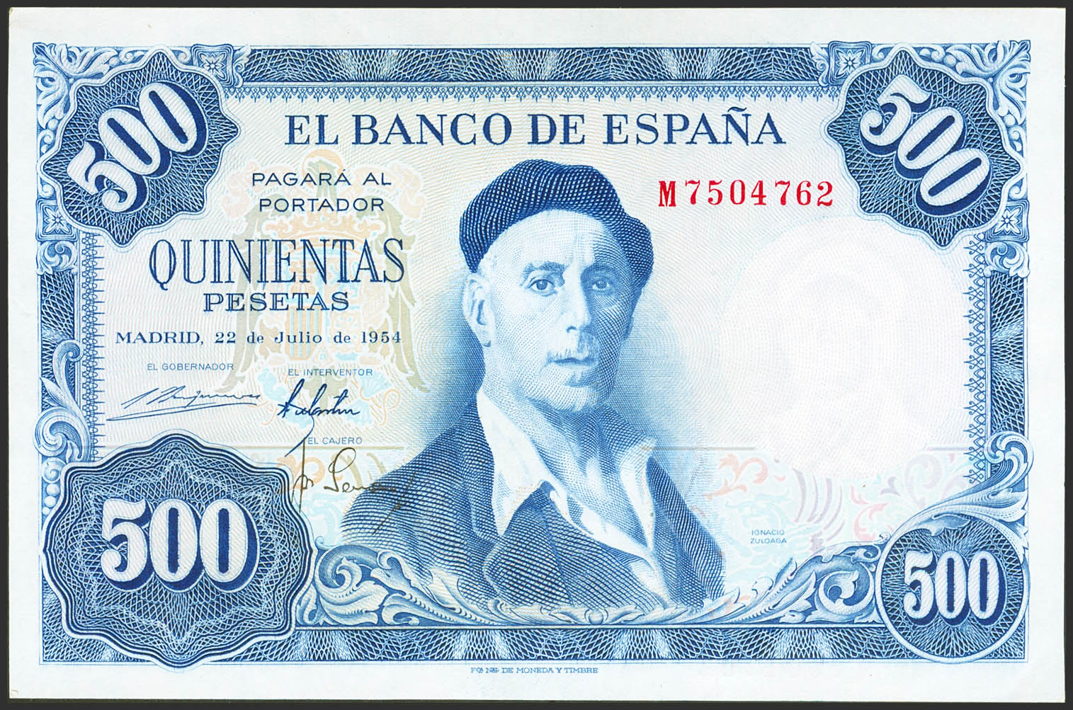 500 Pesetas. 22 de Julio de 1954. Serie M. (Edifil 2023: 468b, Pick: 148a). Conserva todo su apresto original. SC-.