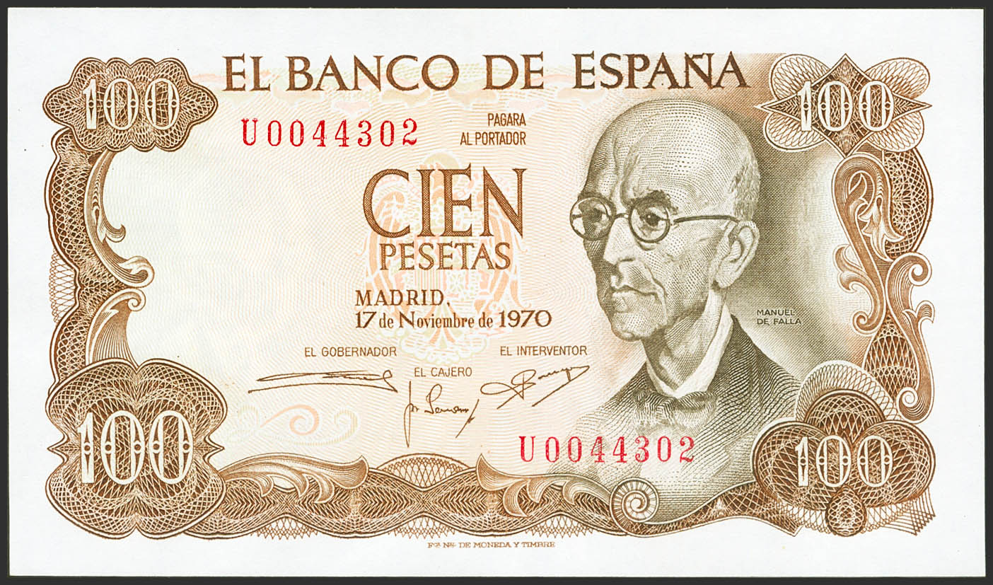 100 Pesetas. 17 de Noviembre de 1970. Serie U. (Edifil 2023: 472b, Pick: 152a). Conserva todo su apresto original. SC.