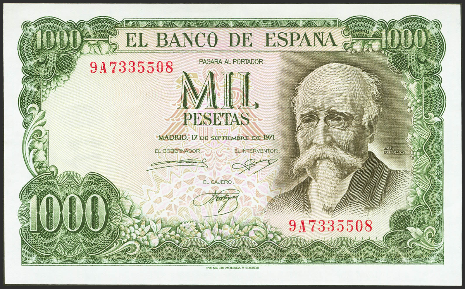 1000 Pesetas. 17 de Septiembre de 1971. Serie especial 9A. (Edifil 2023: 474d, Pick: 154*). Muy raro en esta excepcional calidad, apresto original. SC-.