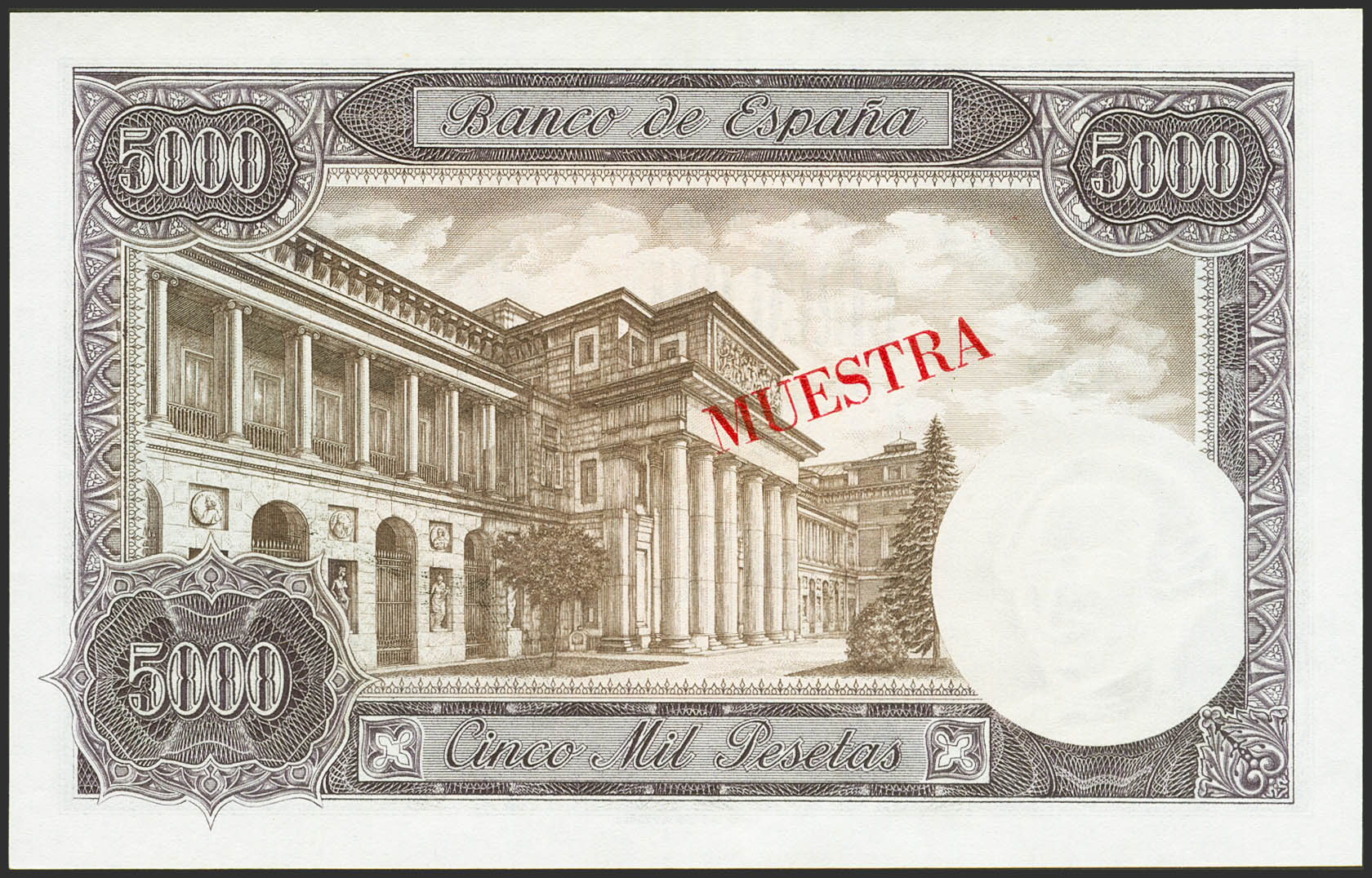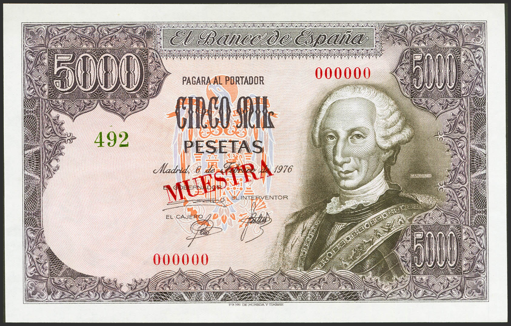 5000 Pesetas. 6 de Febrero de 1976. MUESTRA y numeración 000000. (Edifil 2023: 475M, Pick: 155s). Raro, especialmente en esta excepcional calidad. SC-.