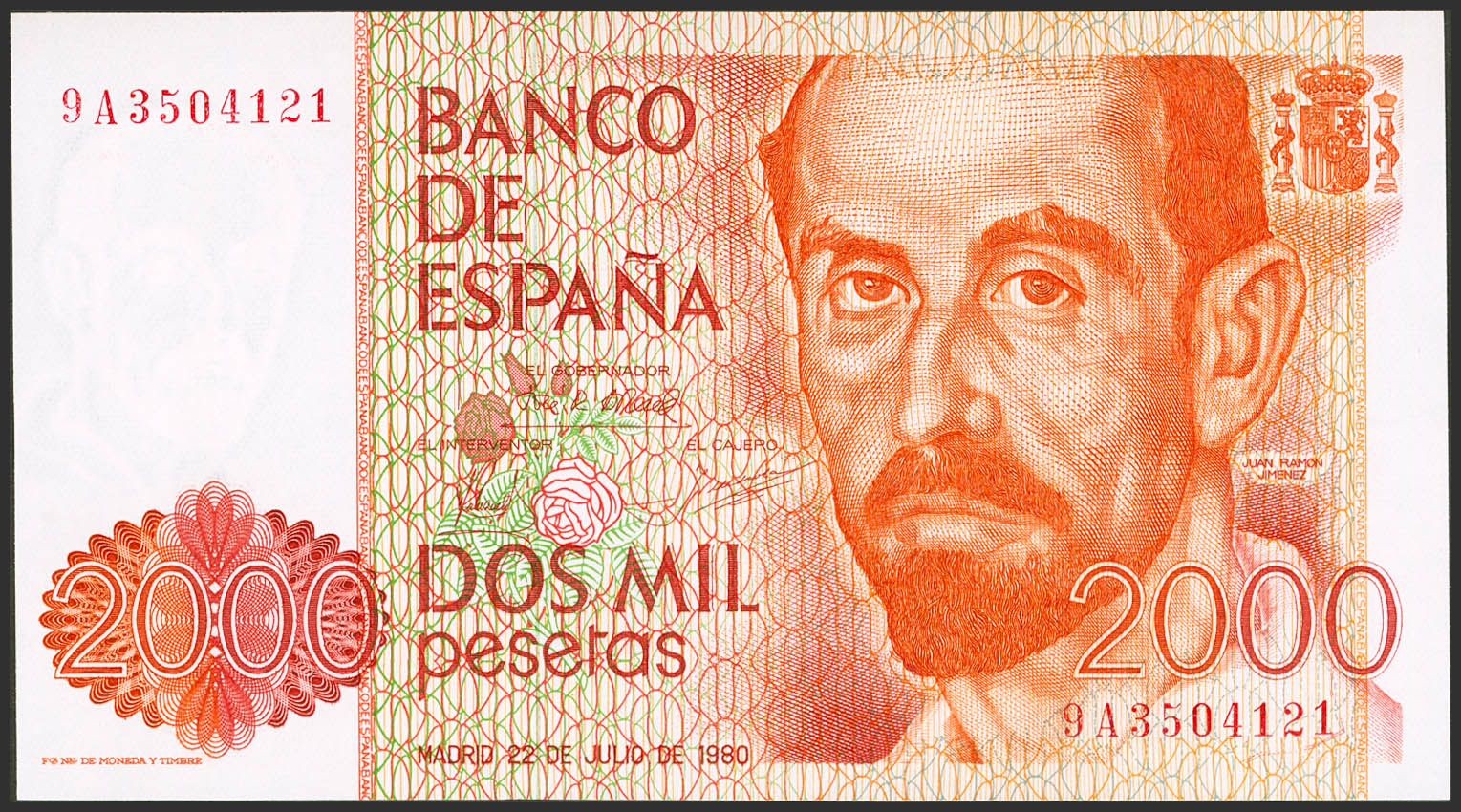 2000 Pesetas. 22 de Julio de 1980. Serie especial 9A. (Edifil 2023: 479b, Pick: 159*). Raro en esta excepcional calidad. SC-.