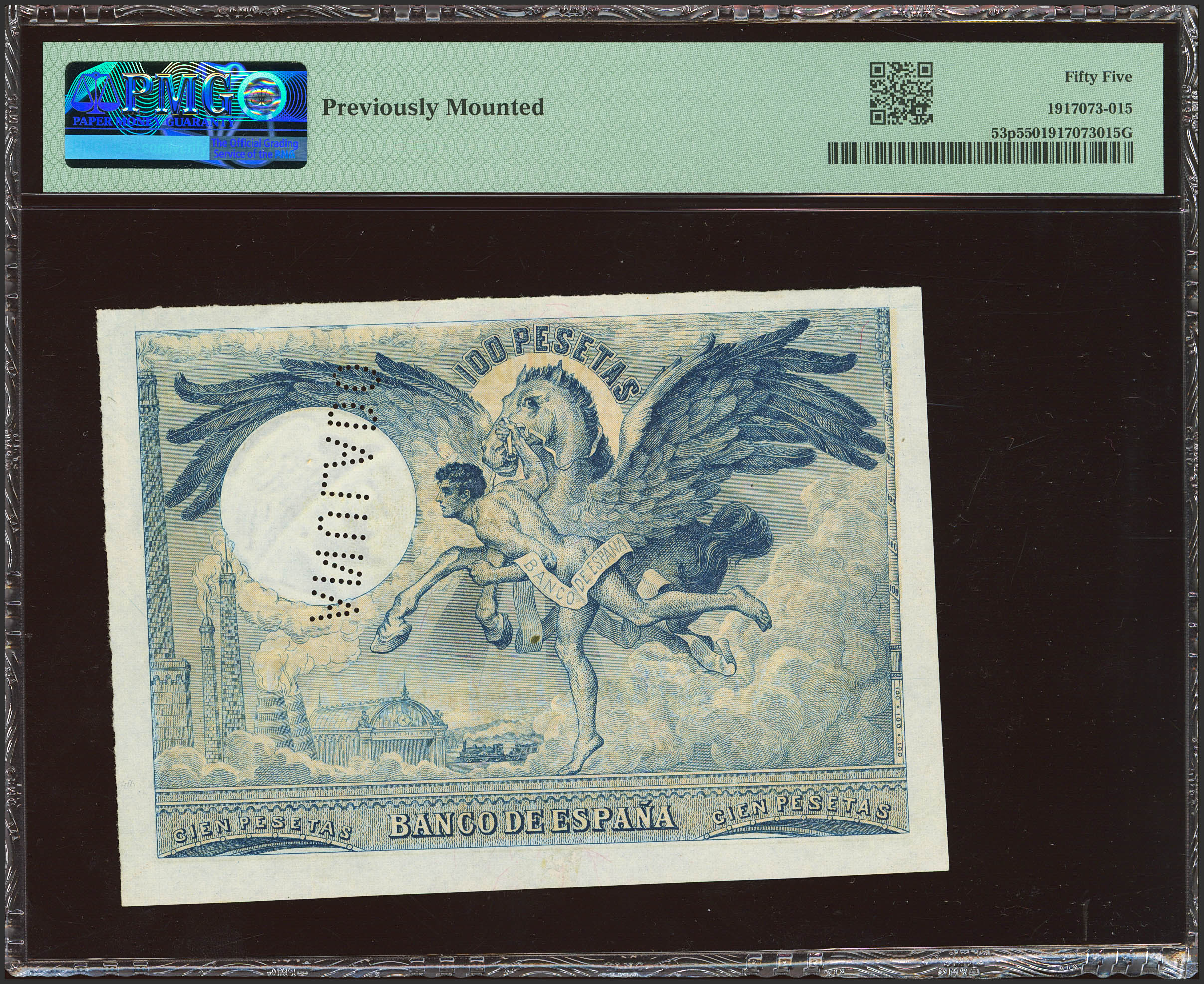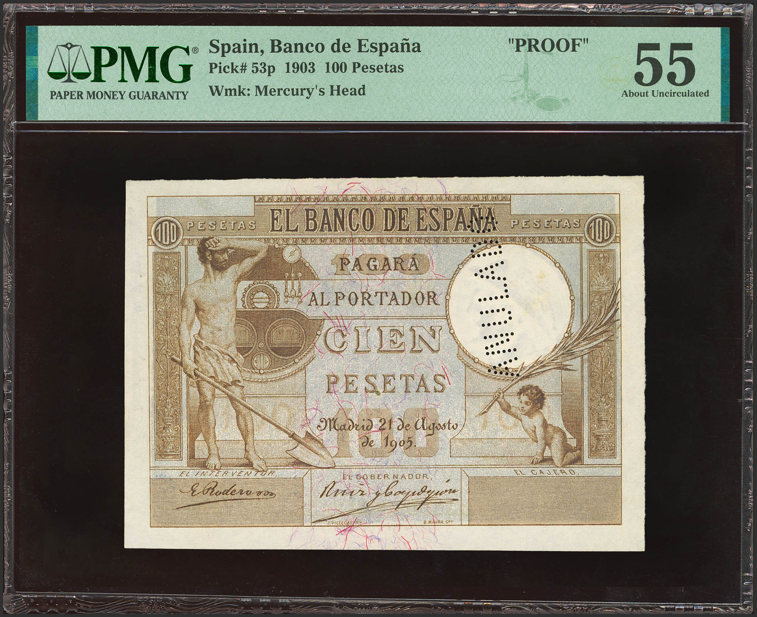 100 Pesetas. 21 de Agosto de 1905. Sin numeración, sin firma de cajero y taladro "ANULADO" (como es habitual en este billete). (Edifil 2023: NE12, Pick: No catalogado). Rarísimo, especialmente en esta calidad. EBC+. Encapsulado PMG55 (previously mounted).En un intento de recuperar el control de la emisión de billetes según el Plan General establecido por el ingeniero Luis Marín, se decidió hacia 1905 poner en emisión más billetes de 100 pesetas con el modelo de 1903, el del Fogonero, pero cambiando la fecha de emisión y realizando algunos ajustes del grabado para mejorar la nitidez. El billete fue aprobado por el Consejo del Banco en sesión del 5 de marzo de 1906, aunque se pidió que el anverso fuera de color azul Prusia. Dado que estos billetes fueron fácilmente falsificados por su diseño no demasiado complejo y monocolor, es de suponer que, a pesar de la aprobación, este esfuerzo fue finalmente desechado por preferir tantear el mercado internacional en busca de suministradores de prestigio que proporcionaran mayores medidas de seguridad. De hecho el contrato con Bradbury es de pocos meses después, lo que llevó a la dimisión de Marín semanas más tarde.Encontrar un ejemplar completo de este billete, procedente de un pliego cortado de 2 x 2 por rasgado manual, es algo extraordinario. Se conocen poquísimas pruebas completas, seguramente menos de cinco, algunas de ellas en negro. Este ejemplar que se ofrece en subasta parece una prueba de color, pues el anverso usa tonos bistre y el reverso azul Prusia sobre fondo amarillo, resultando en una combinación bastante acertada. Desconocemos el color aprobado por el Banco para el reverso, pero cabe pensar en que el de este espécimen sería muy similar al elegido para el anverso.