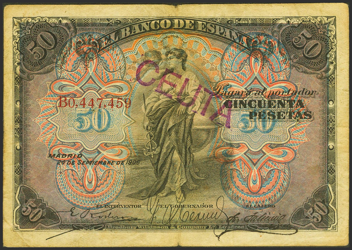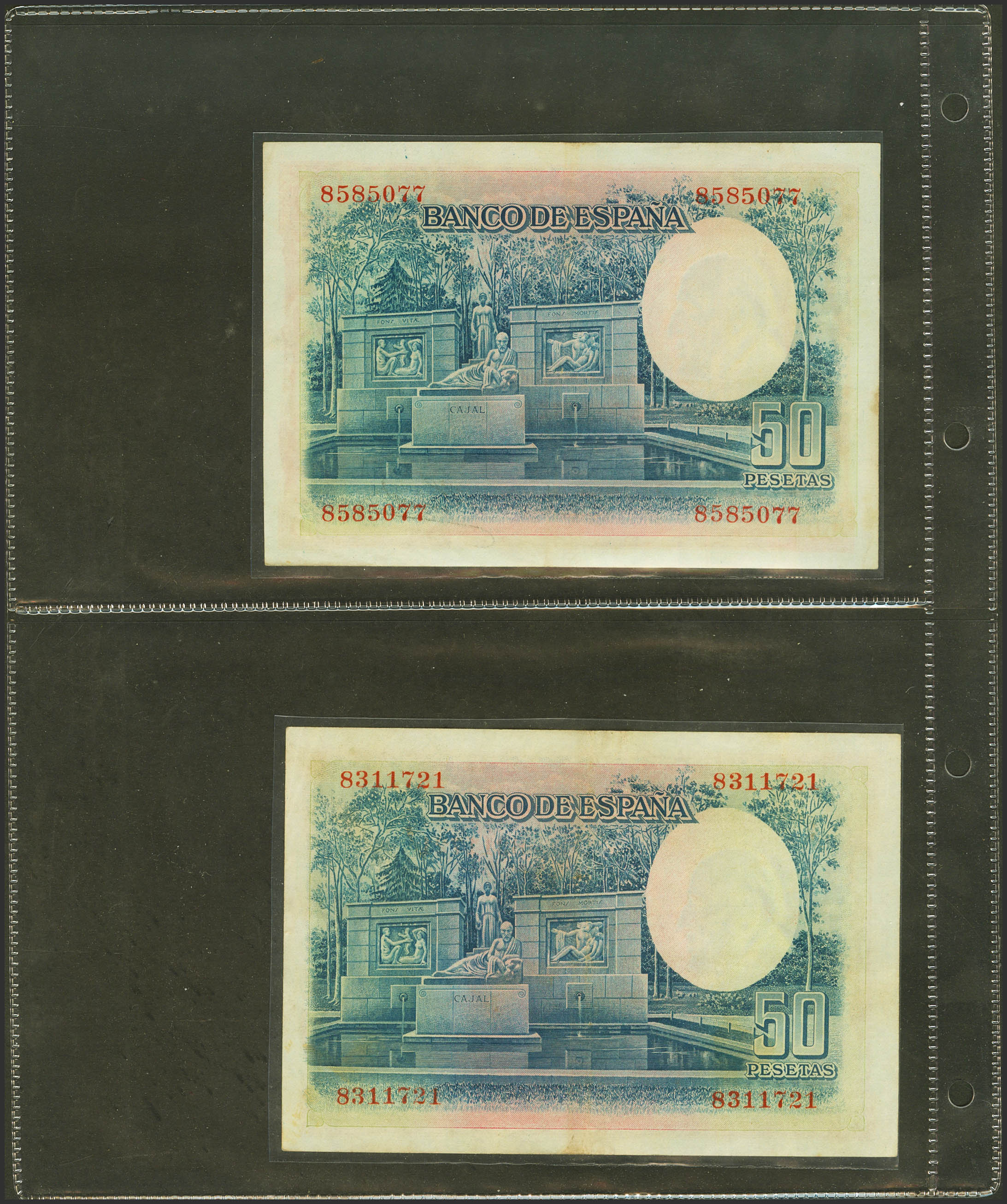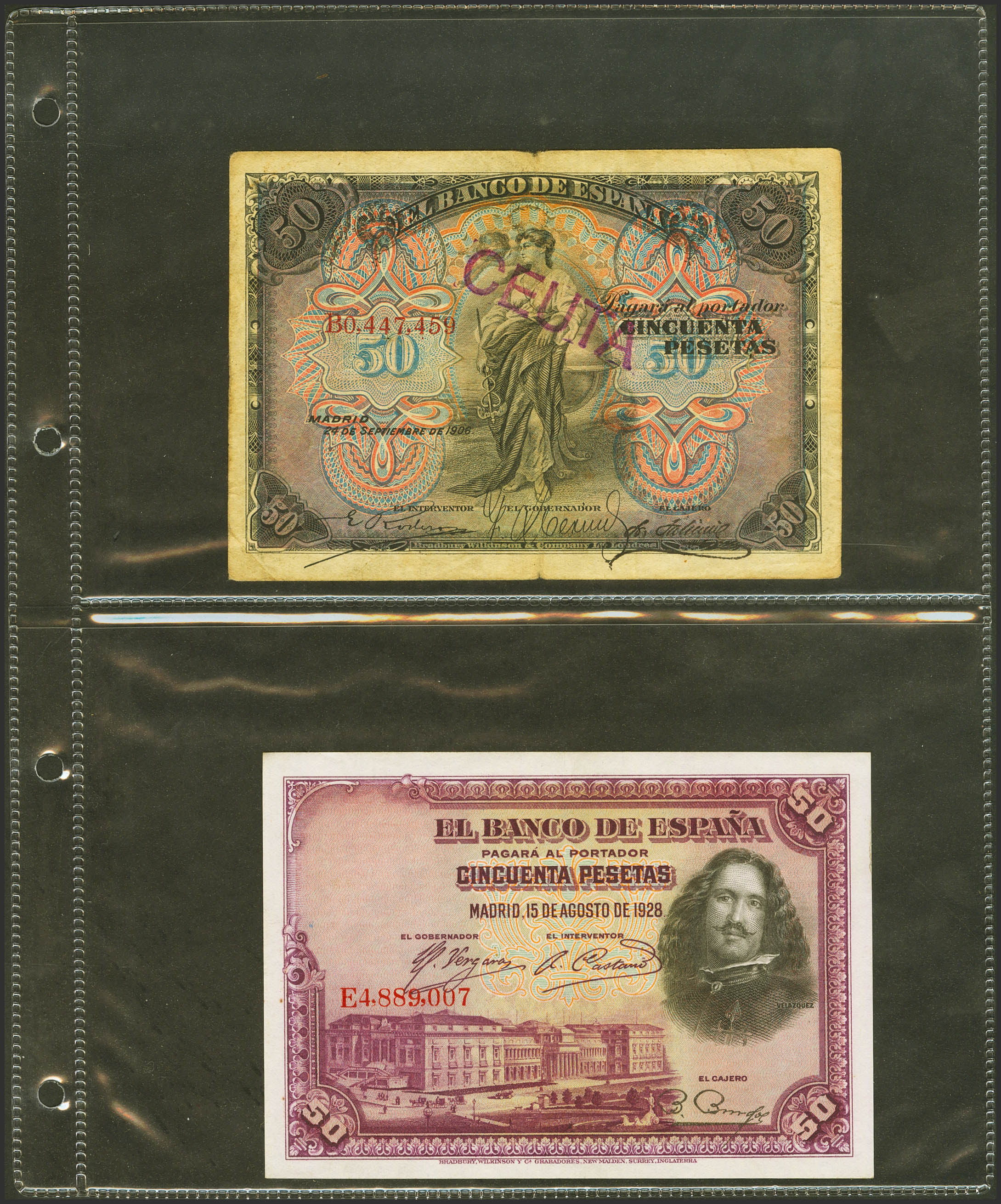 Conjunto de 19 billetes del Banco de España, de diferentes emisiones y en diversas calidades e incluyendo varias alteraciones químicas. A EXAMINAR.
