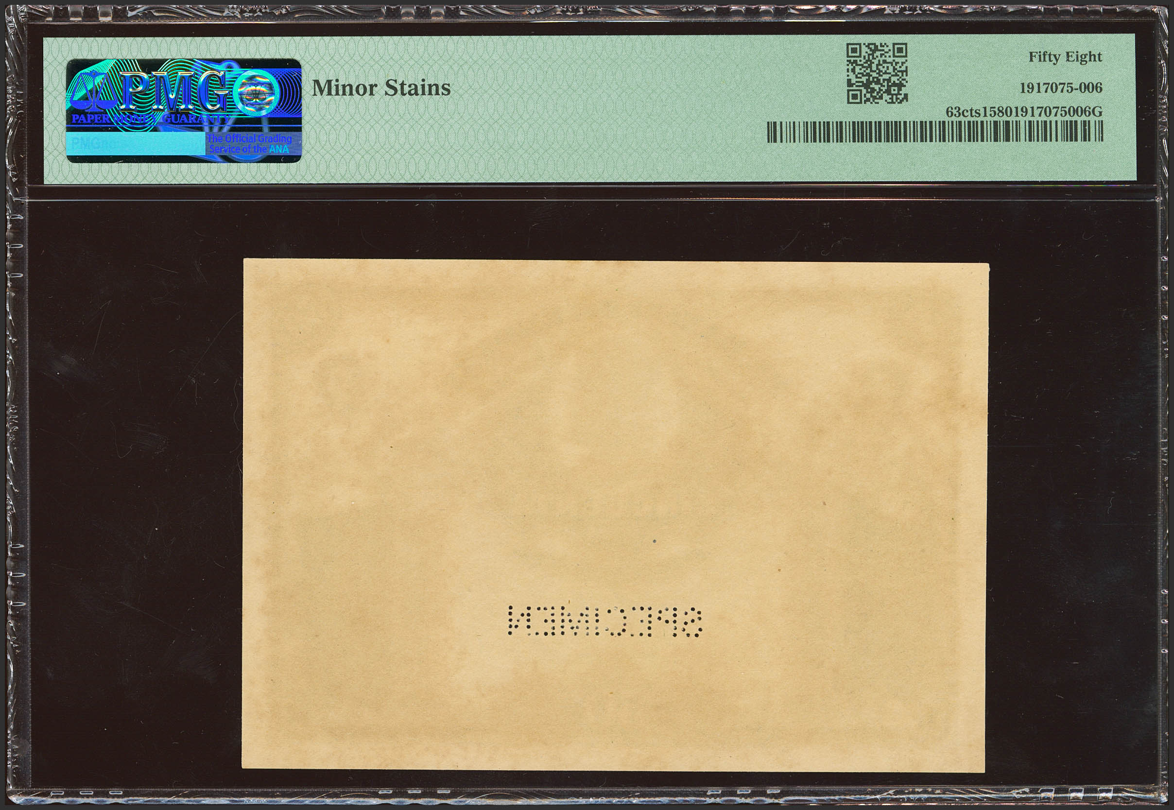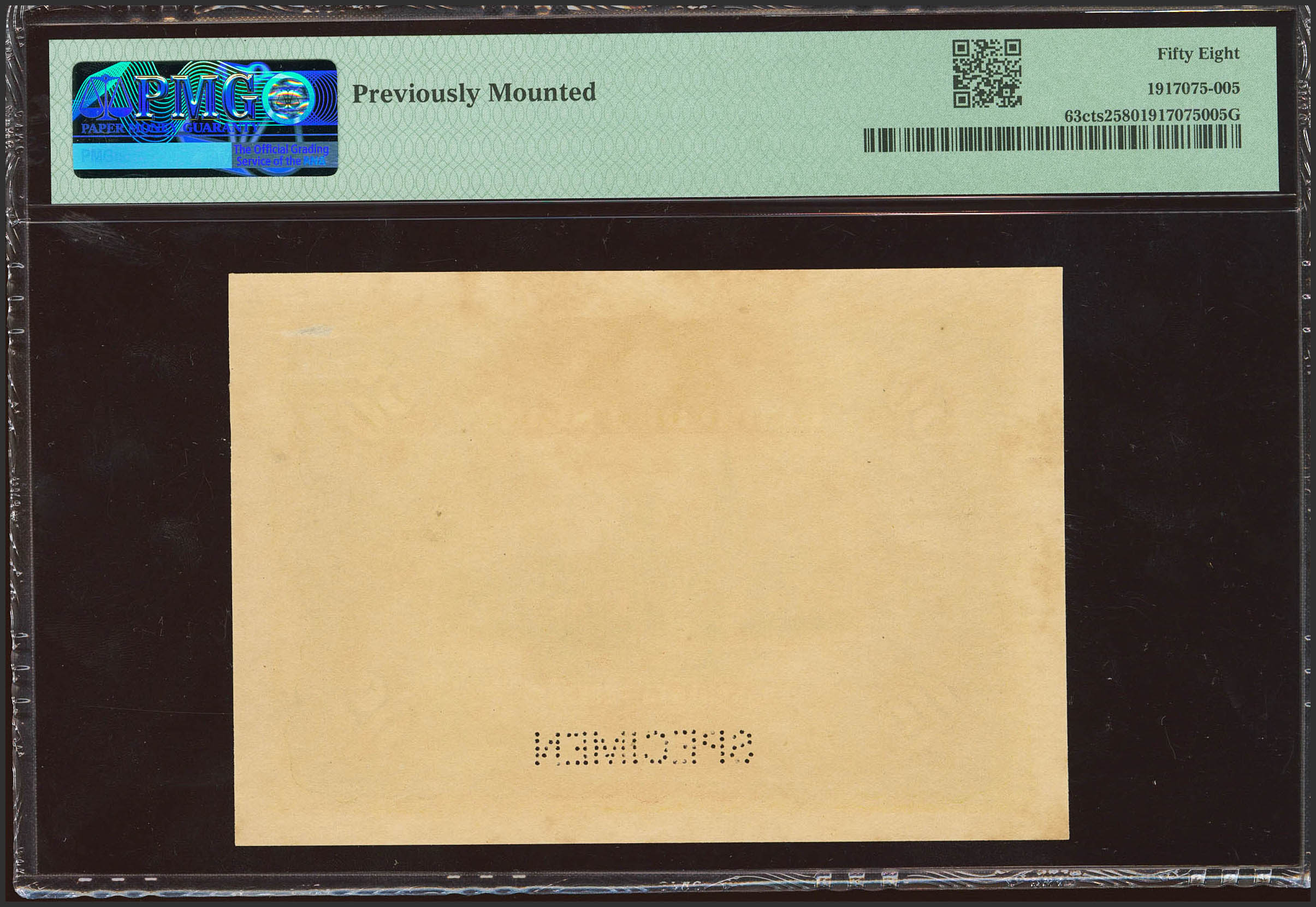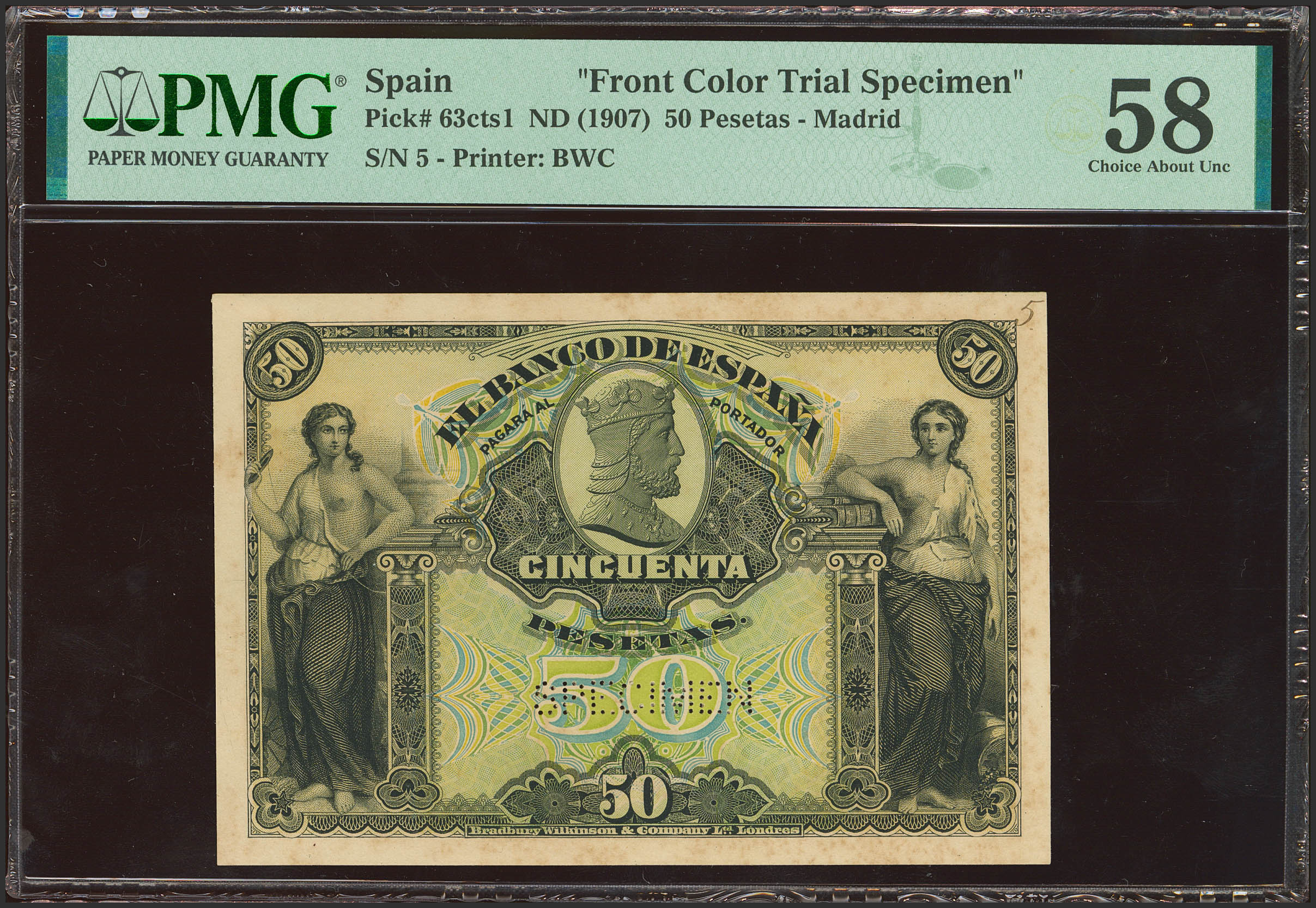 50 Pesetas. 15 de Julio de 1907. Prueba de color de anverso y reverso, sin numeración y taladrado SPECIMEN. (Edifil 2023: 319Pa, Pick: 63cts1, 63cts2). Muy raro conjunto. EBC++. Encapsulado PMG58 (minor stains) / 58 (previously mounted).