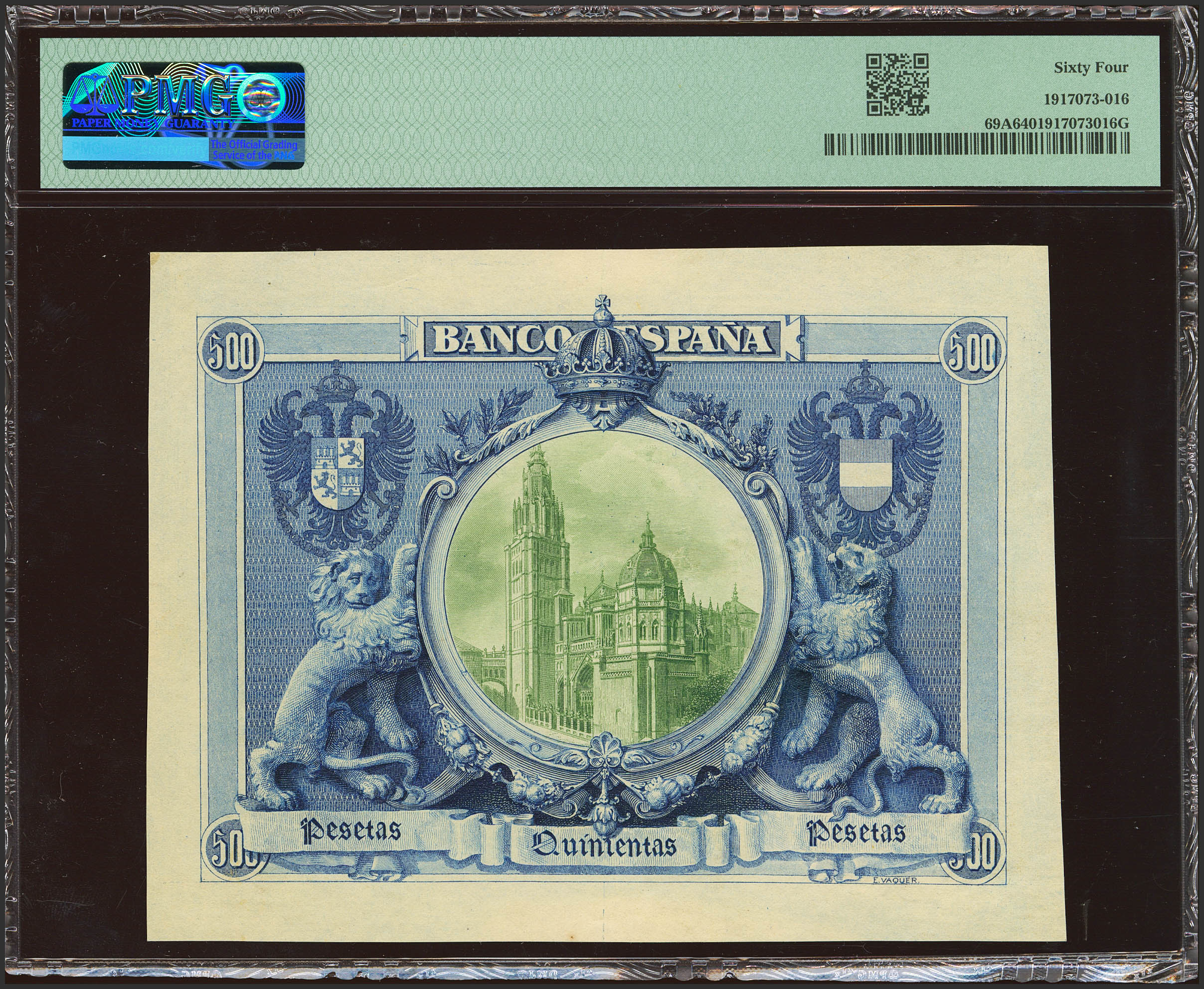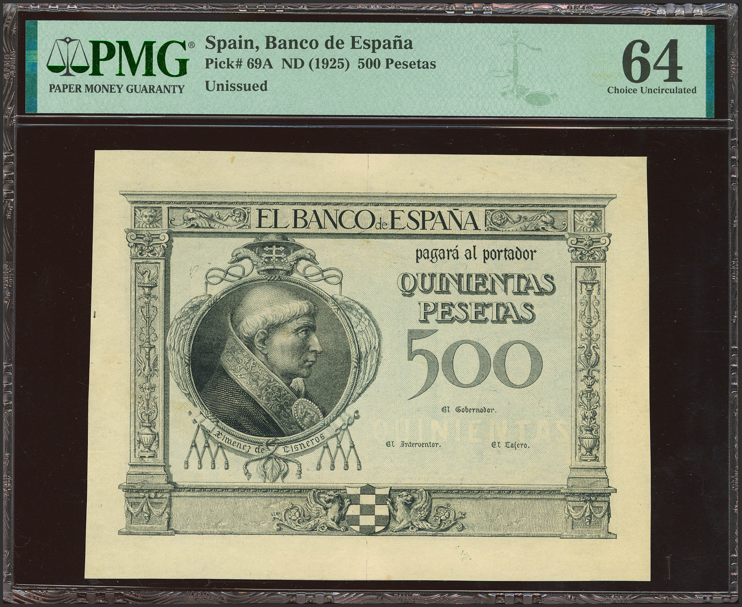 Después de varios intentos de producir nuevamente billetes en los talleres del Banco de España durante las dos primeras décadas del siglo XX, con poco éxito (emisión de 1903-1905) o prácticamente nulo durante la época de dominio de la Bradbury (billetes no emitidos de 1908, 1914, 1915), los grabadores del Banco hicieron un último intento de demostrar sus capacidades. El billete de 1.000 pesetas de mayo de 1907, a pesar de encajar formalmente con la emisión de 1906-1907 y no con la de reserva de 1907, fue puesto en circulación en fechas tan tardías como el 30 de enero de 1925. Apenas una semana antes aparece fechada la prueba de 500 pesetas de 1925 con la imagen del Cardenal Cisneros. Es posible que el pensamiento de los grabadores fuera aprovechar la puesta en circulación de un billete “nacional” tras dos décadas de dominio inglés para dar un último impulso al proyecto original de producir los billetes en los talleres del Banco. Pero la realidad es que en la misma fecha de 30 de enero de 1925 también entró en circulación el billete de 500 pesetas de julio de 1907 que echaría al traste la idea de que el billete de Cisneros tuviera éxito. Quizá pensaron en usarlo como emisión de reserva a la expectativa de la aceptación del famoso “Ángel”. No están claras, por lo tanto, las circunstancias de esta emisión frustrada que no pasó de la fase de pruebas. Lo que sí parece evidente es que en pocos años después la misma idea de dedicar un billete al Cardenal Cisneros sí tuvo un final feliz. Estas pruebas de 500 pesetas son bastante raras y existen bastantes variantes, con o sin fondos y en diferentes colores. Las pruebas de color completas de anverso y reverso como la ofrecida son muchísimo más raras.