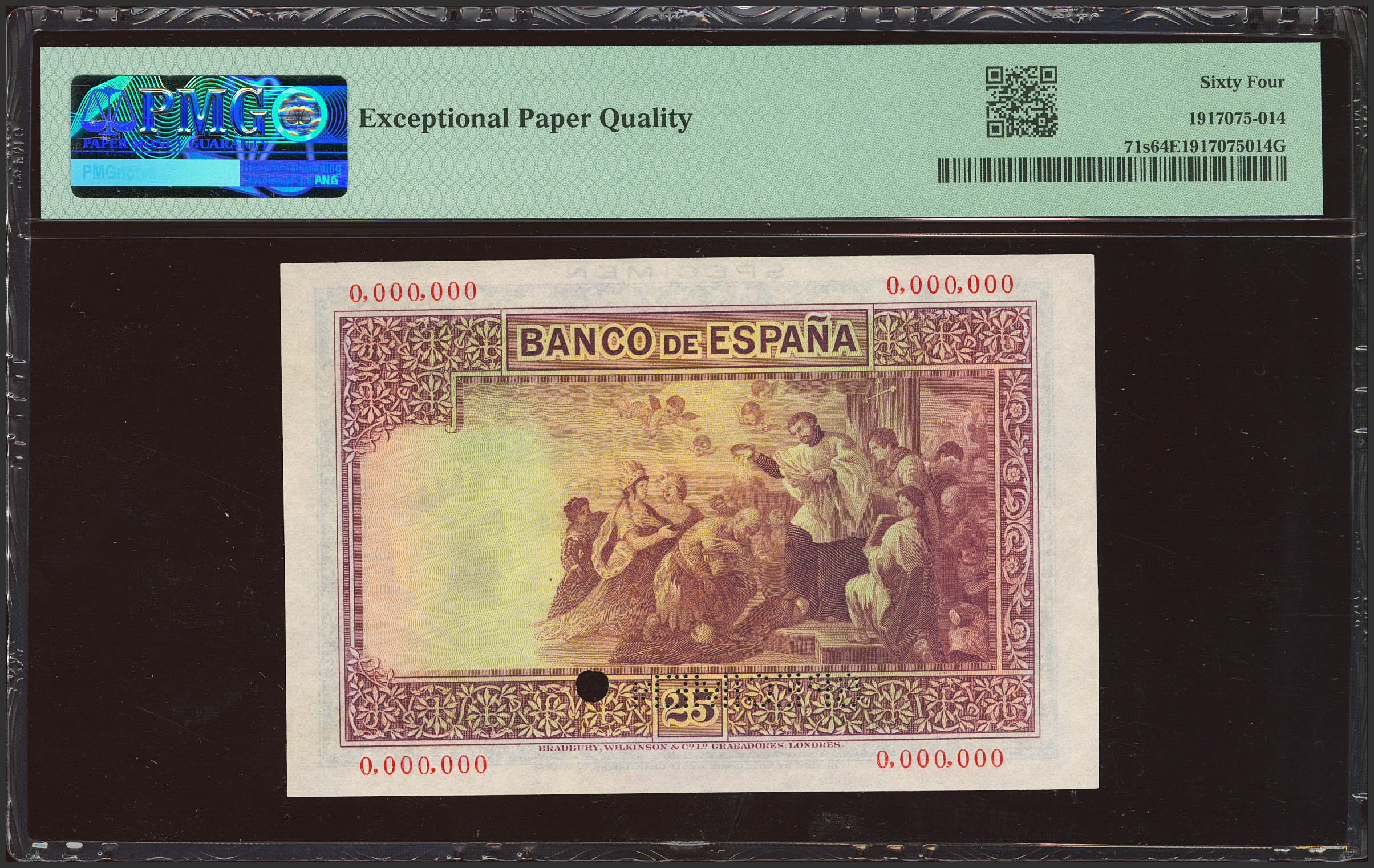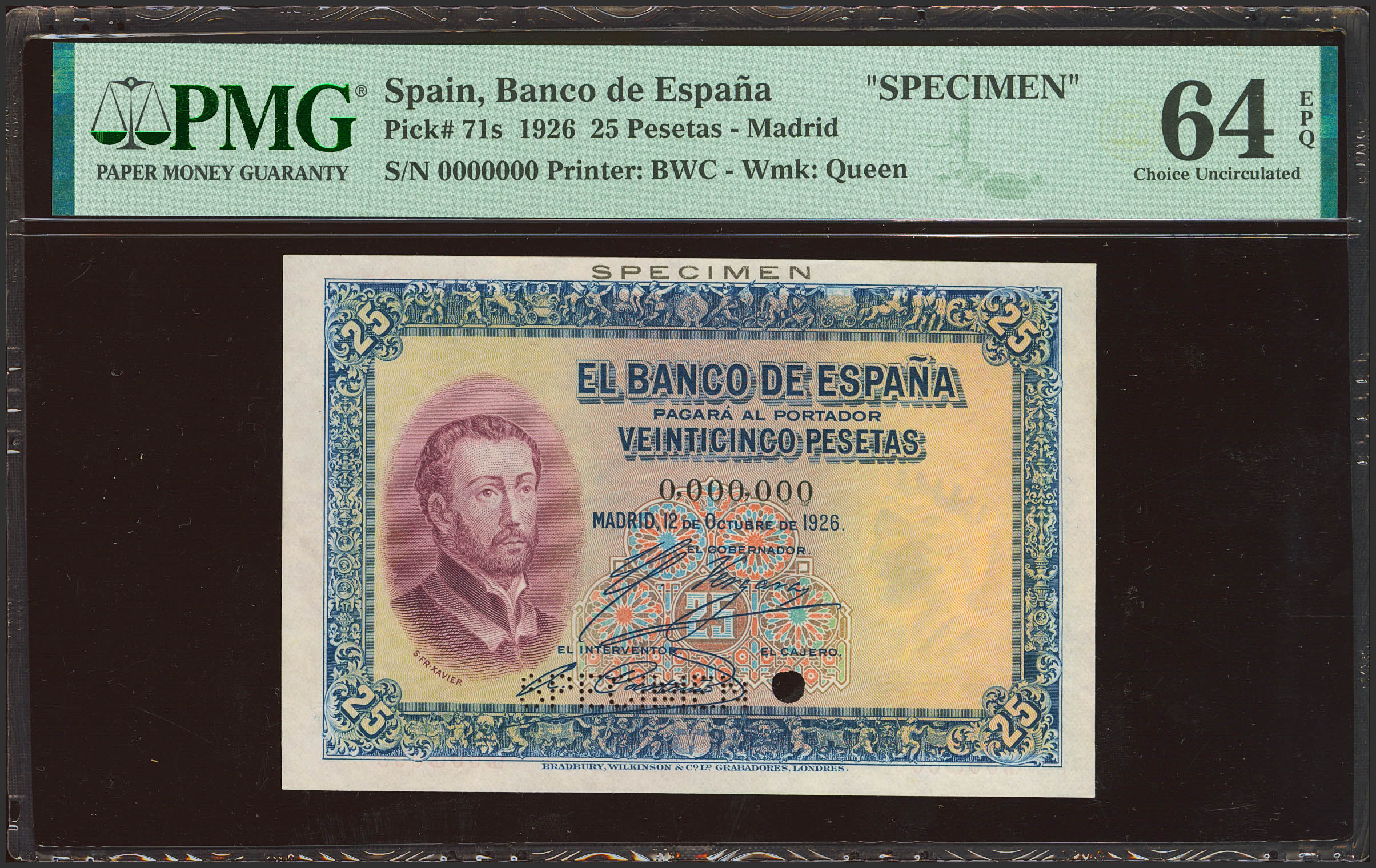 25 Pesetas. 12 de Octubre de 1926. Sin serie, Nº0.000.000, sin firma de cajero, taladrado SPECIMEN y con la palabra SPECIMEN en el margen superior. (Edifil 2023: 325M, Pick: 71s). Extraordinariamente raro, especialmente en esta excepcional calidad. SC. Encapsulado PMG64EPQ.