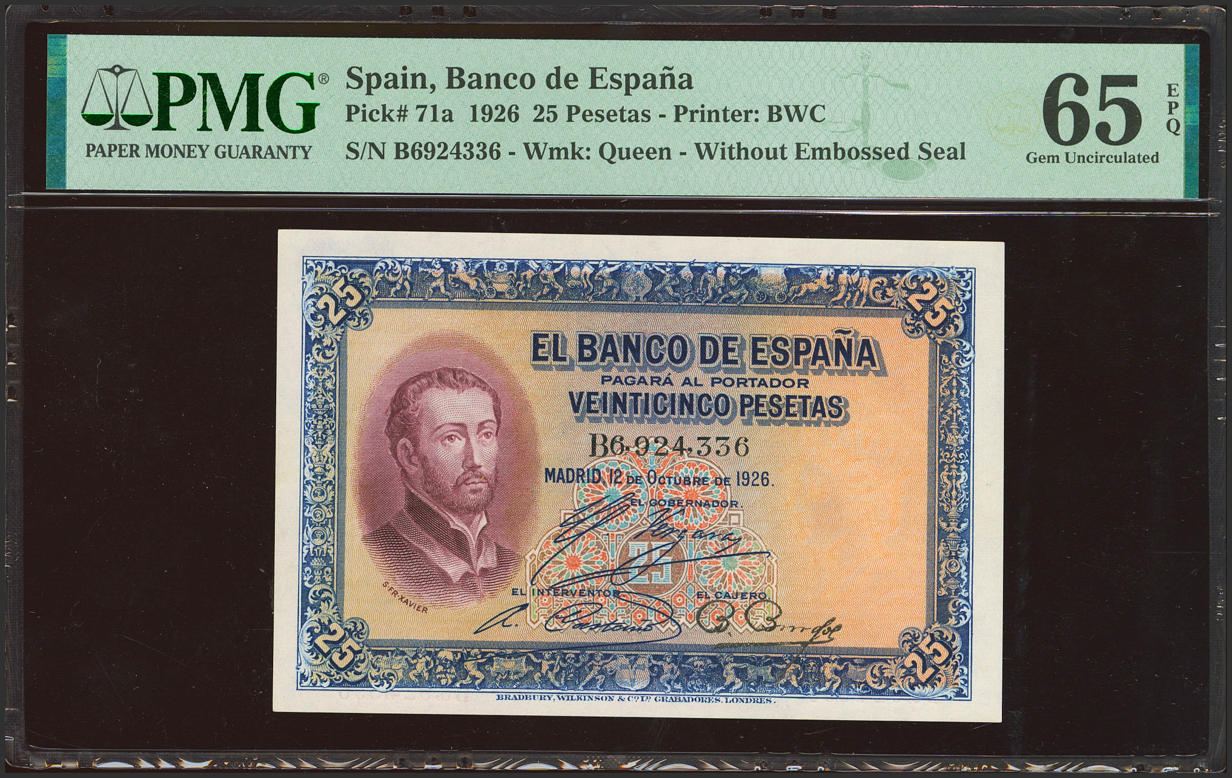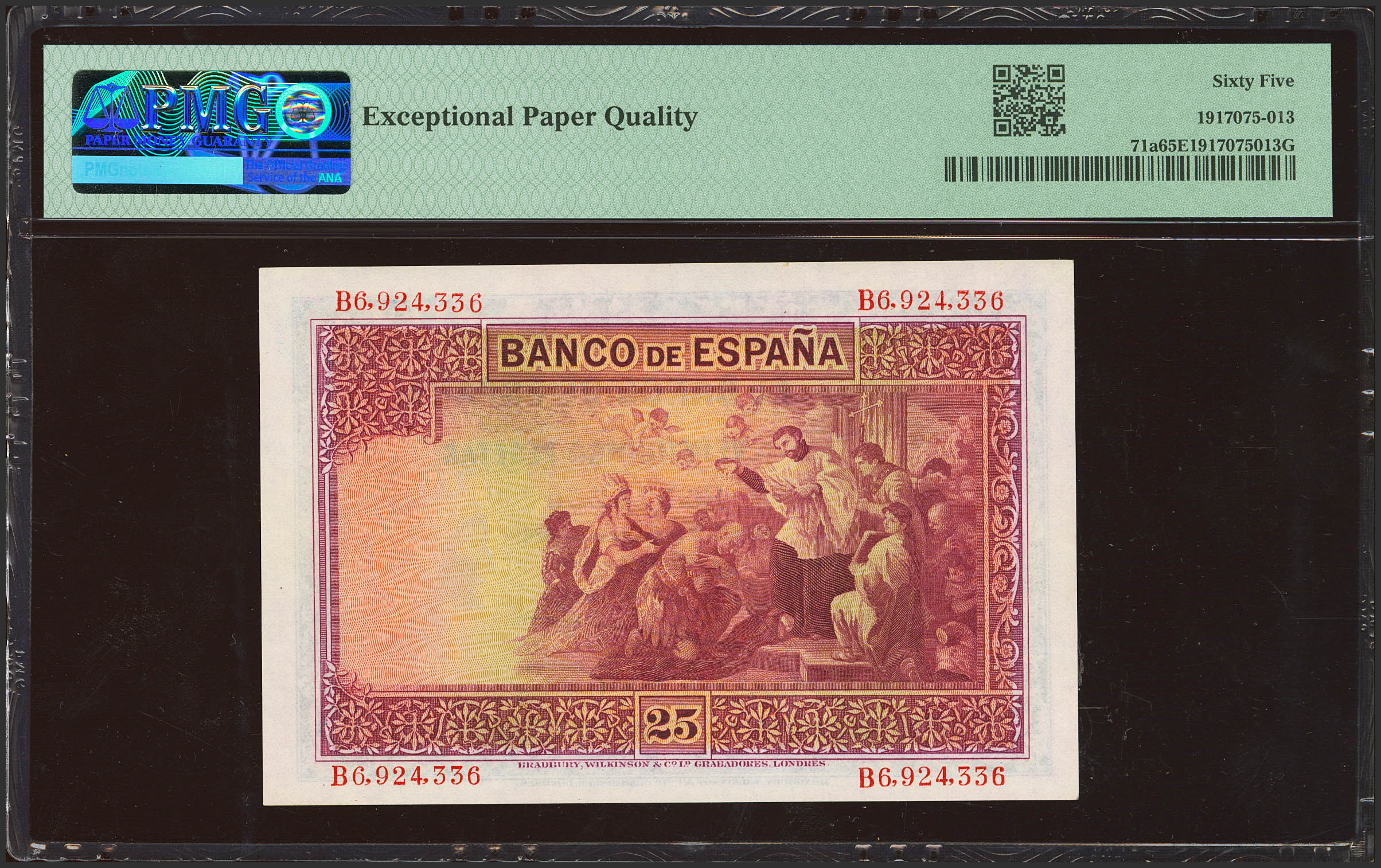 25 Pesetas. 12 de Octubre de 1926. Serie B, última serie emitida. (Edifil 2023: 325a, Pick: 71a). Muy raro en esta excepcional calidad, apresto original. SC. Encapsulado PMG65EPQ (para hacernos idea de la rareza, a fecha 1 de Marzo de 2024, este billete es el quinto mejor calificado junto a otro billete en PMG).