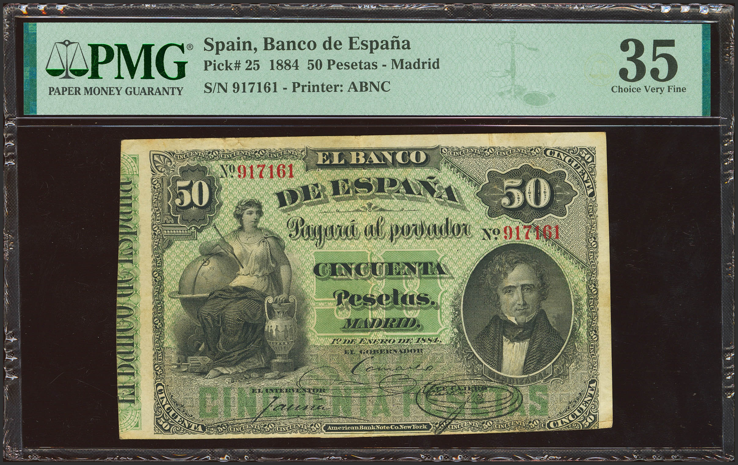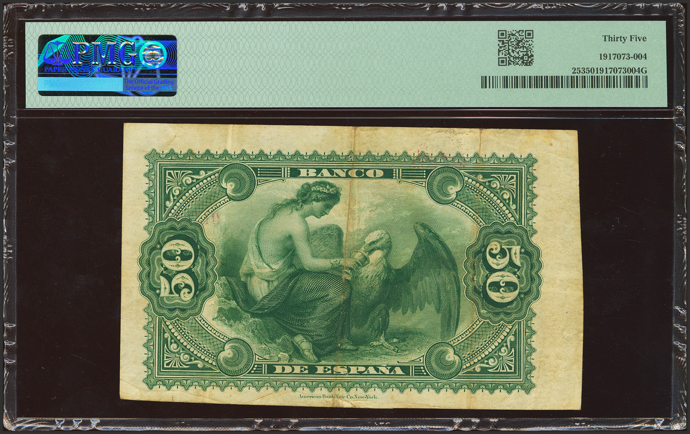 50 Pesetas. 1 de Enero de 1884. Sin serie. (Edifil 2023: 283, Pick: 25). Raro, especialmente sin reparaciones, puntitos de grapa. MBC+. Encapsulado PMG35.