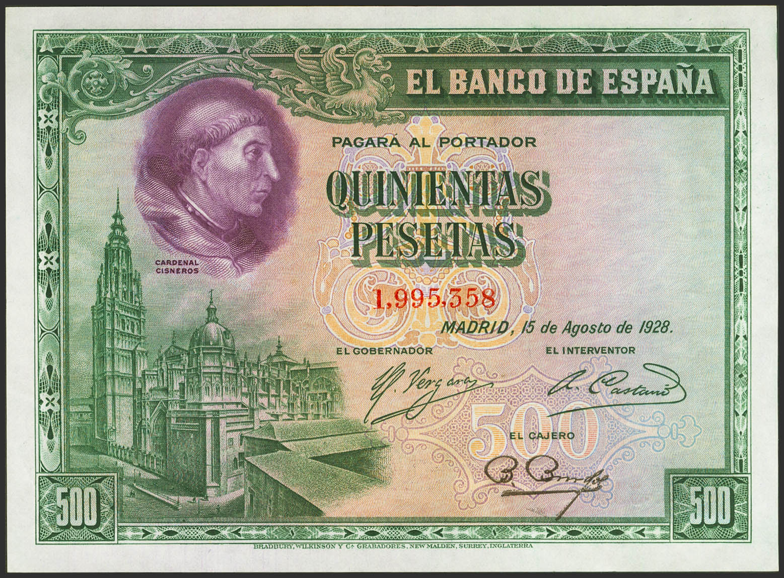500 Pesetas. 15 de Agosto de 1928. Sin serie. (Edifil 2023: 356, Pick: 77a). Conserva todo su apresto original. SC-.