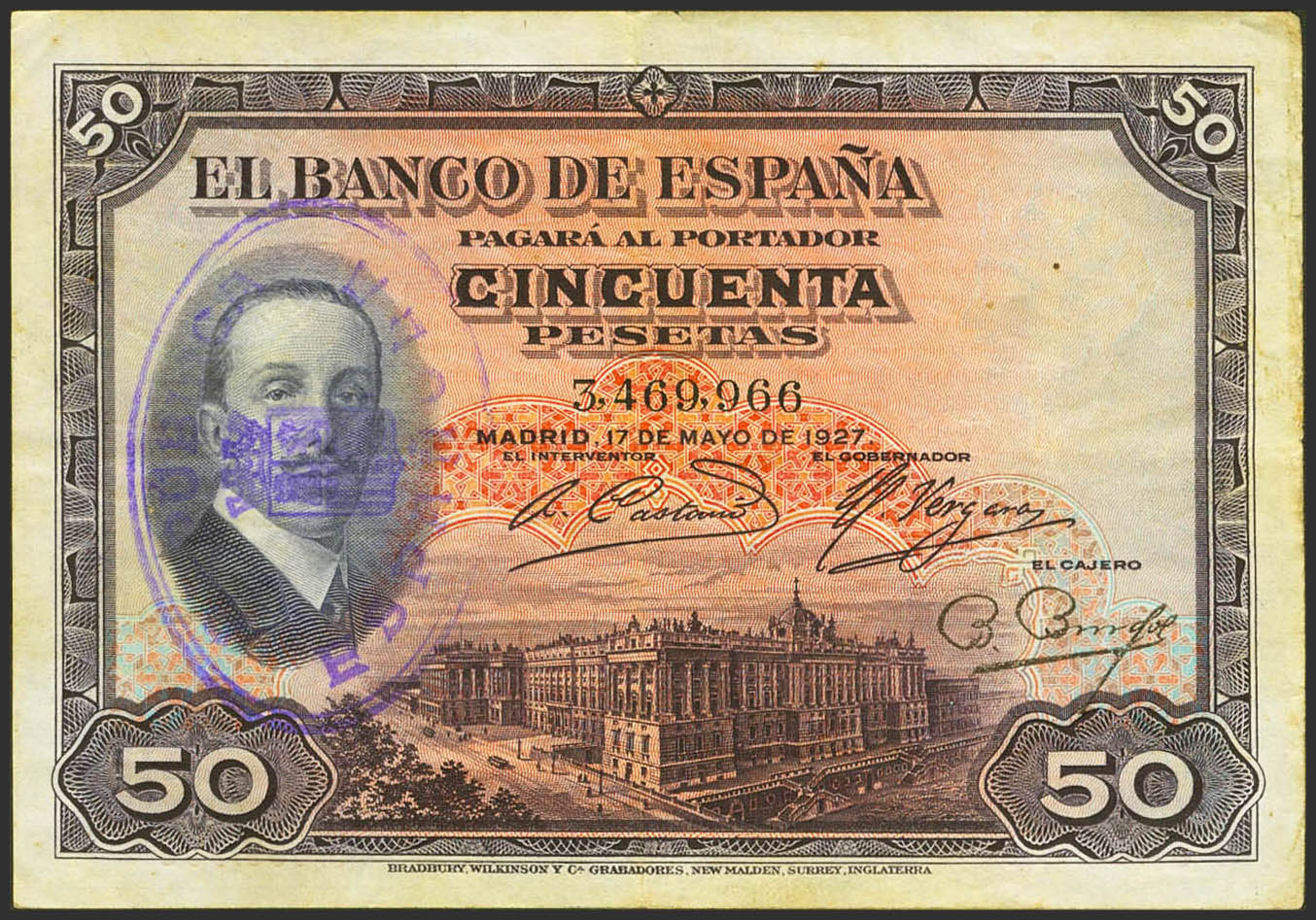 Conjunto de 4 billetes del 50 pesetas emitidos el 17 de Mayo de 1927 y el 15 de Agosto de 1928, respectivamente, todos ellos sin serie y con sello de caucho REPUBLICA / ESPAÑOLA. (Edifil 2023: 332, 331). MBC.