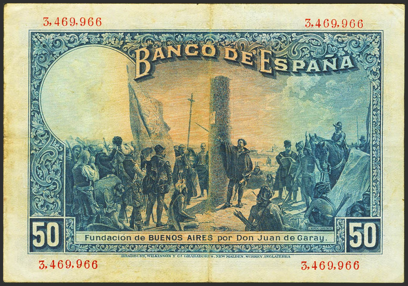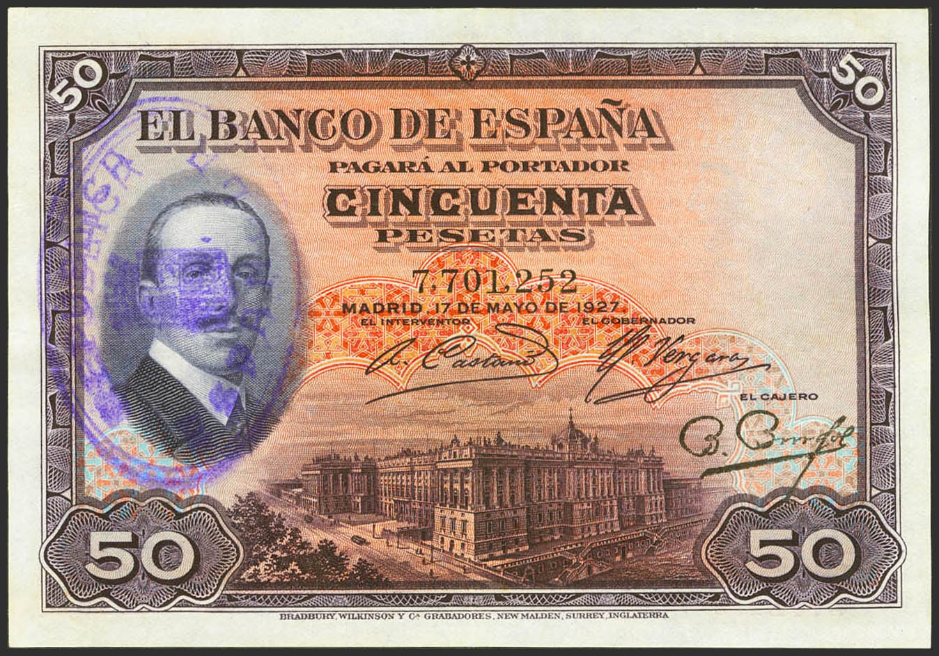 Conjunto de 4 billetes del 50 pesetas emitidos el 17 de Mayo de 1927 y el 15 de Agosto de 1928, respectivamente, todos ellos sin serie y con sello de caucho REPUBLICA / ESPAÑOLA. (Edifil 2023: 332, 331). MBC.