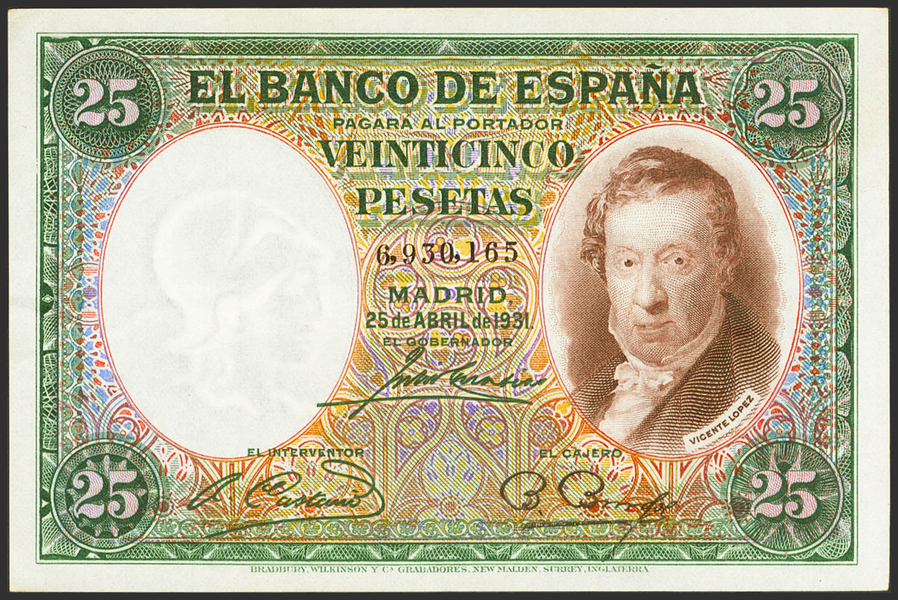 25 Pesetas. 25 de Abril de 1931. Sin serie. (Edifil 2023: 358, Pick: 81). Conserva todo su apresto original. EBC+.