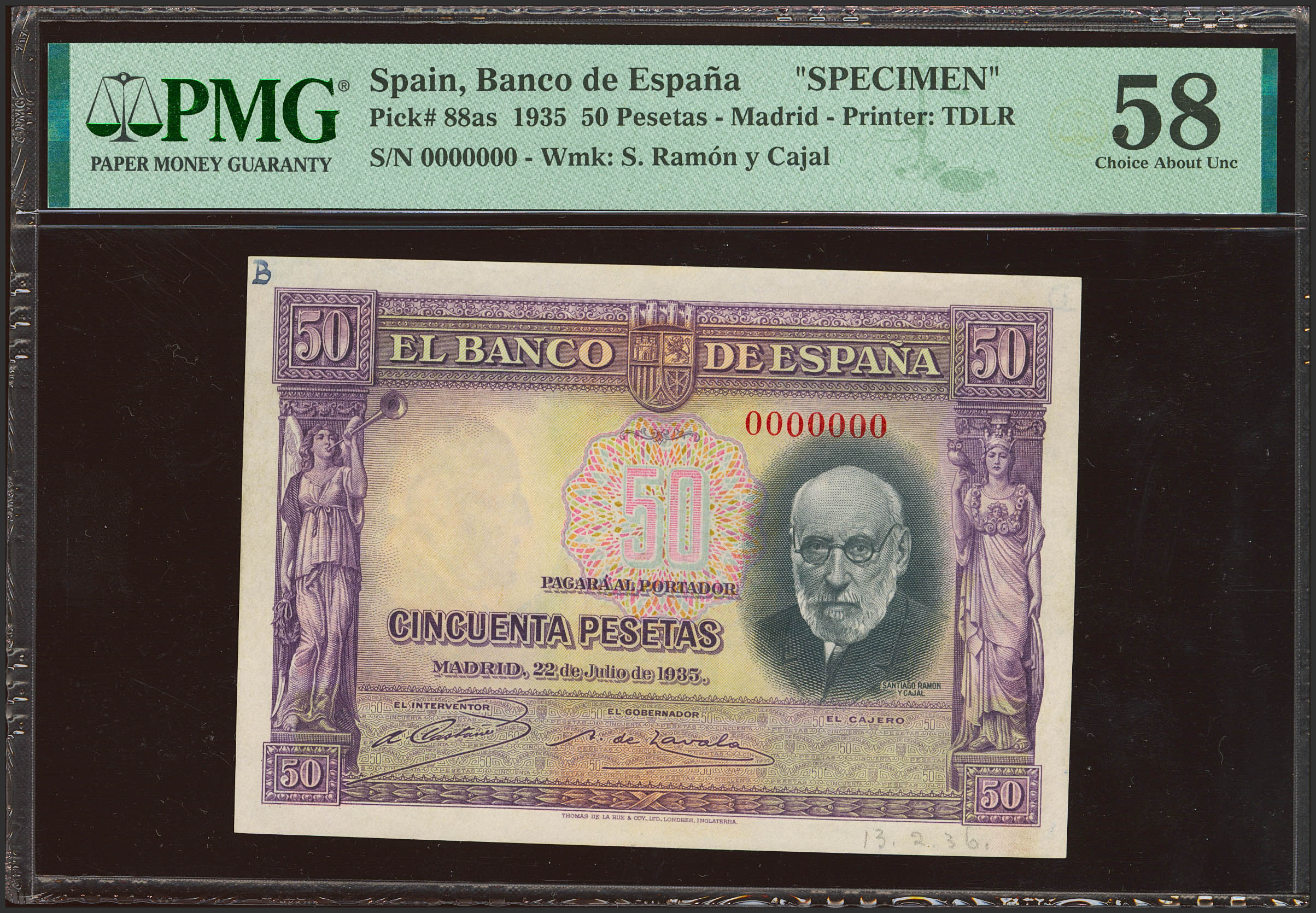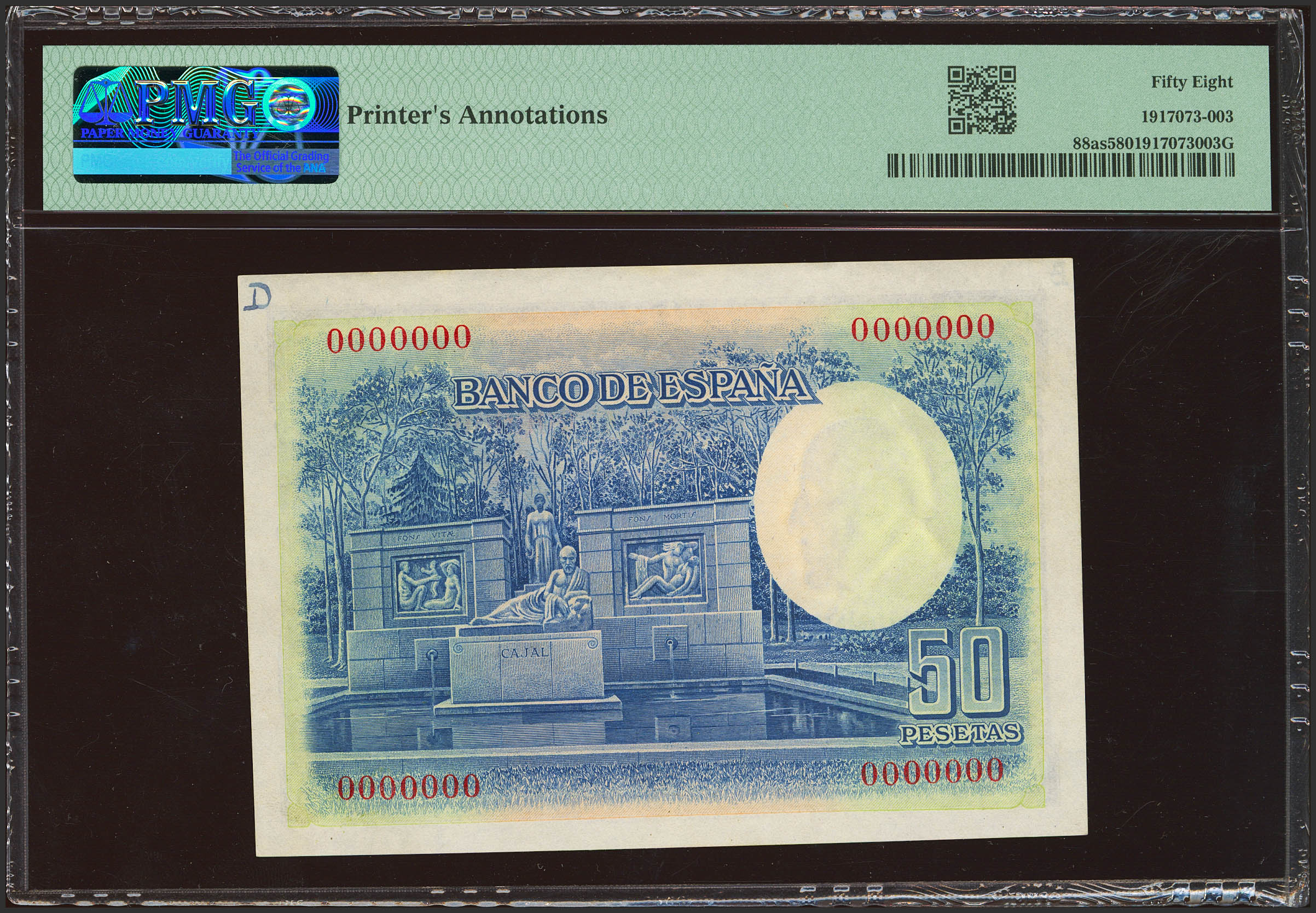 50 Pesetas. 22 de Julio de 1935. Serie A, numeración 0.000.000, taladro "SPECIMEN" y sin firma del cajero. (Edifil 2023: 366M, Pick: 88as). Muy raro. EBC++. Encapsulado PMG58 (printer's annotations).
