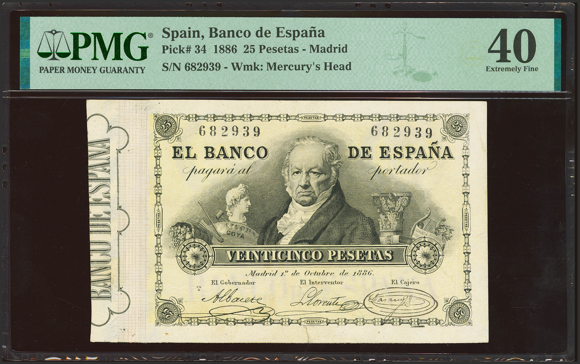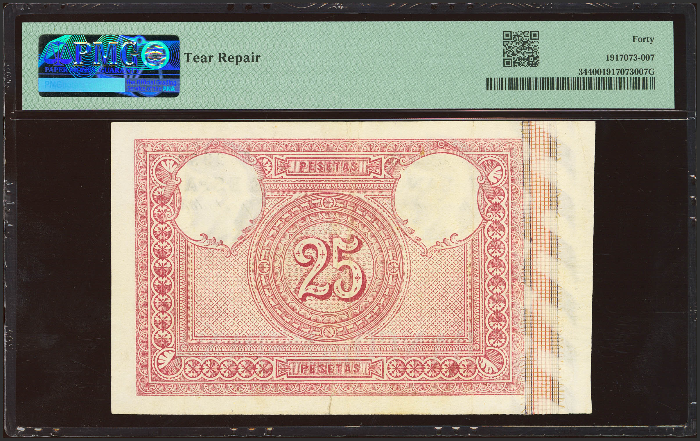 25 Pesetas. 1 de Octubre de 1886. Sin serie. (Edifil 2023: 292, Pick: 34). Muy raro, mínimamente reparado. EBC-. Encapsulado PMG40 (tear repair) (para hacernos idea de la rareza, a fecha 1 de Marzo de 2024, este billete es el tercero mejor calificado en PMG).