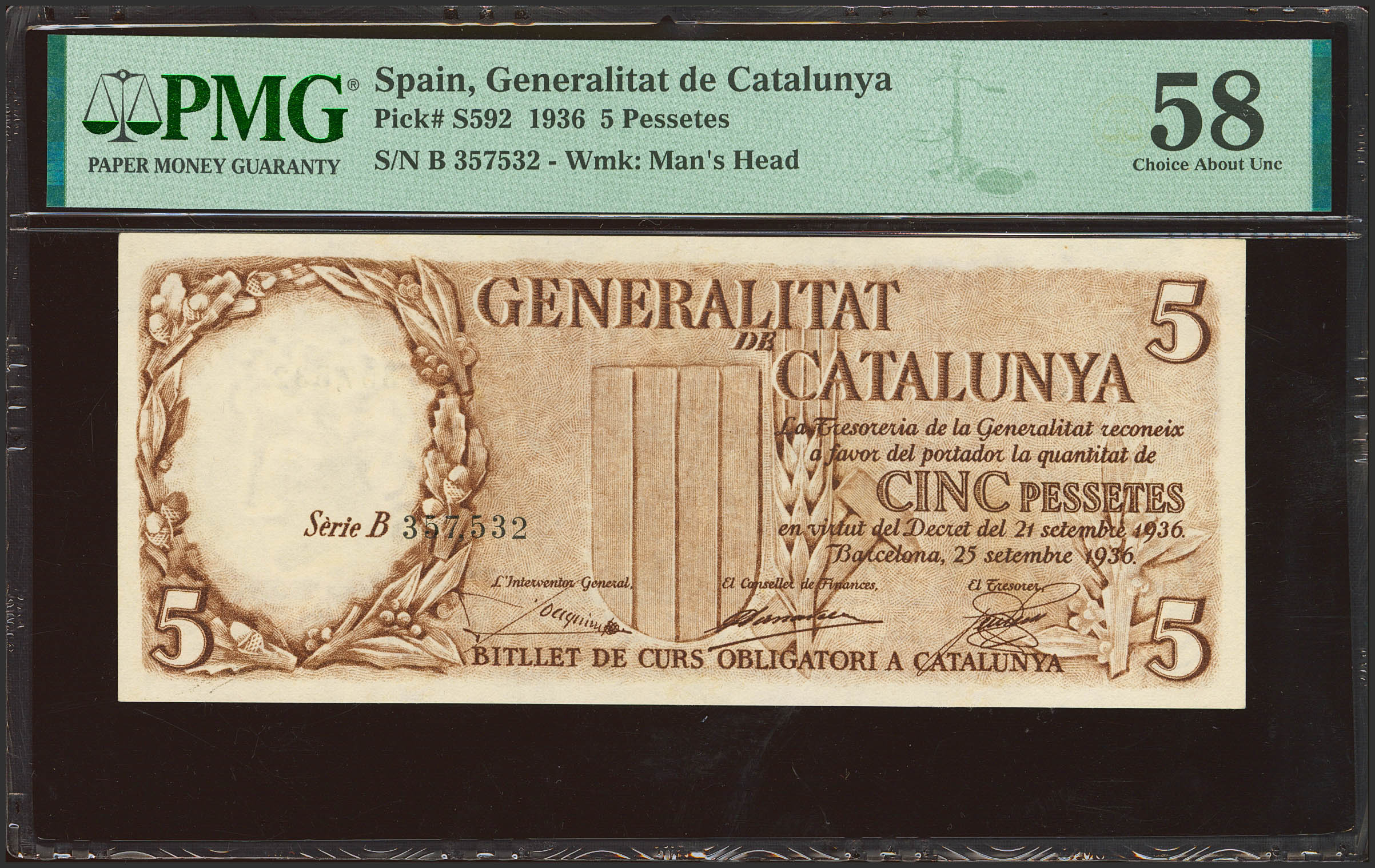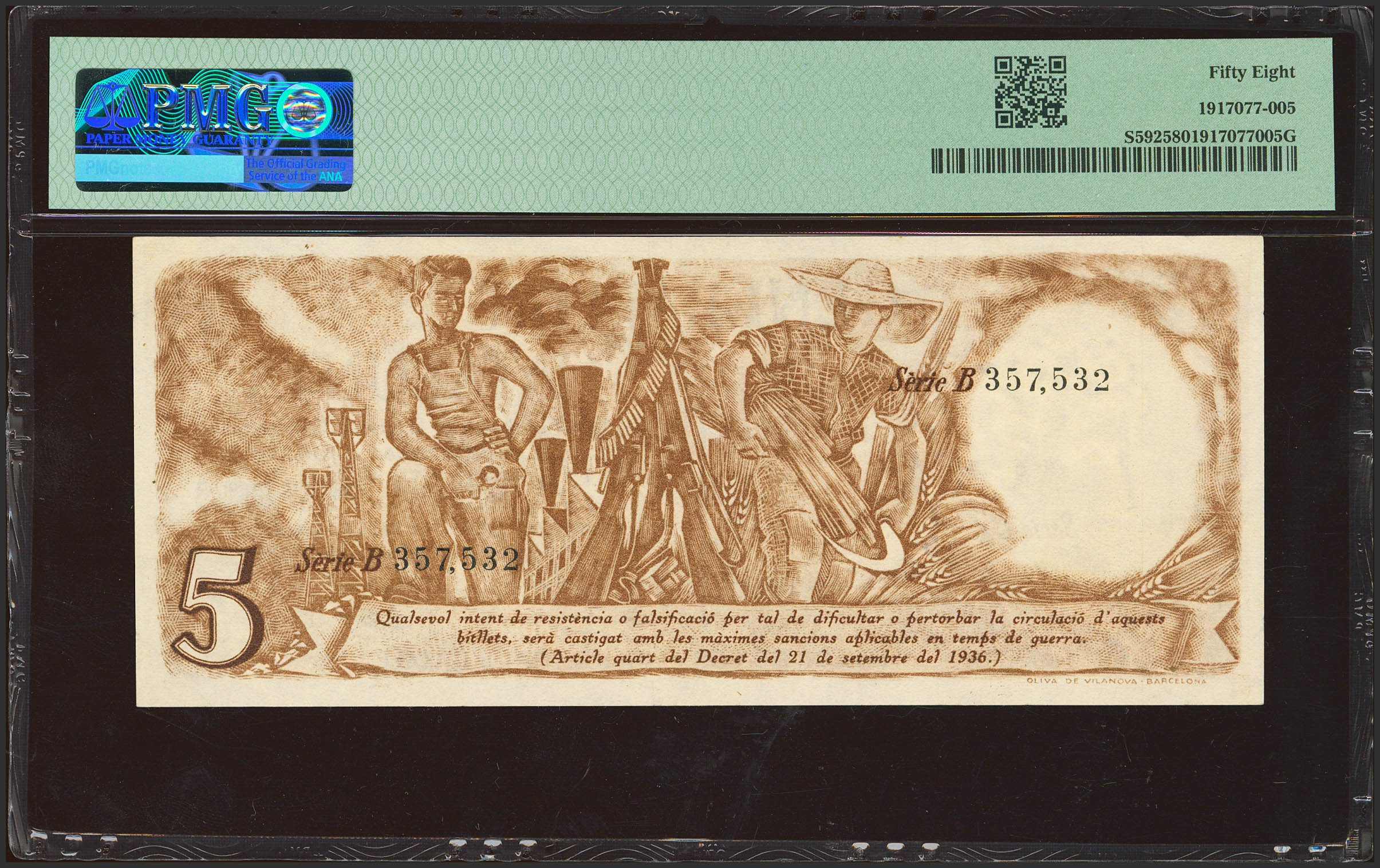 5 Pesetas. 25 de Septiembre de 1936. Generalitat de Catalunya. Serie B. (Edifil 2023: 373, Pick: 592). Raro en esta calidad. EBC++. Encapsulado PMG58 (para hacernos idea de la rareza, a fecha 1 de Marzo de 2024, este billete es el quinto mejor calificado junto a otro billete en PMG).
