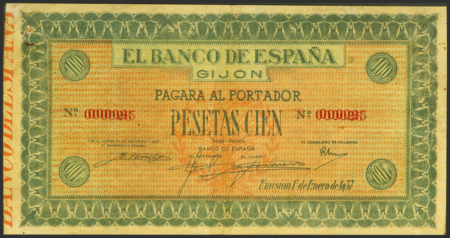 100 Pesetas. NO EMITIDO. 1 de Enero de 1937. Banco de España, Gijón. Sin serie y con numeración doble 000025-000026, sin la viñeta del reverso y sin matriz. (Edifil 2023: NE31Pe). Rarísimo, pequeña rotura debajo de la numeración de la derecha provocada por el propio numerador, sin importancia alguna e indicado sólo a título informativo, Ramón Cobo en su obra de papel moneda de organismos estatales indica que pudiera tratarse de una prueba, da por conocida la numeración 000027-000028 (en el mismo billete, al igual que el ofrecido). MBC.La creación de billetes de mejor calidad que los talones puestos en circulación desde noviembre de 1936 fue una obsesión del Consejo Interprovincial de Asturias y León. Ya hemos comentado anteriormente su historia y no ahondaremos en ella ahora. Todos los billetes de 100 pesetas de la emisión fallida de Gijón de enero de 1937 son muy raros. Normalmente los escasísimos billetes que se ven de esta emisión tienen matriz y el reverso impreso. En esta ocasión, el ejemplar ofrecido parece una prueba en la que, además del anverso completo, aparece sólo el fondo del reverso y no el diseño, pero en cambio muestra cómo sería la numeración, con seis cifras y la misma tipografía que luego se empleó en septiembre de 1937, un dato extraordinario de esta serie no emitida.