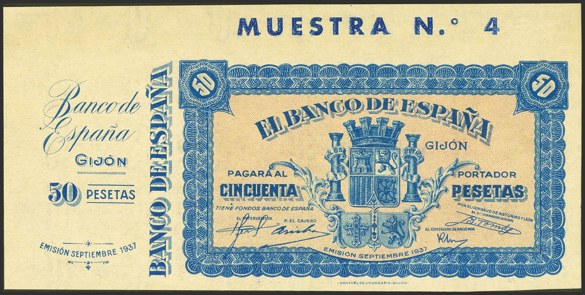50 Pesetas. NO EMITIDO. Septiembre 1937. Sucursal de Gijón. Sin serie, con la matriz a la izquierda y borde de hoja superior que incluye la inscripción marginal "Muestra Nº4". (Edifil 2023: NE33, Pick: S579). Muy raro, coincide con el fotografiado en el catalogo Filabo. SC.