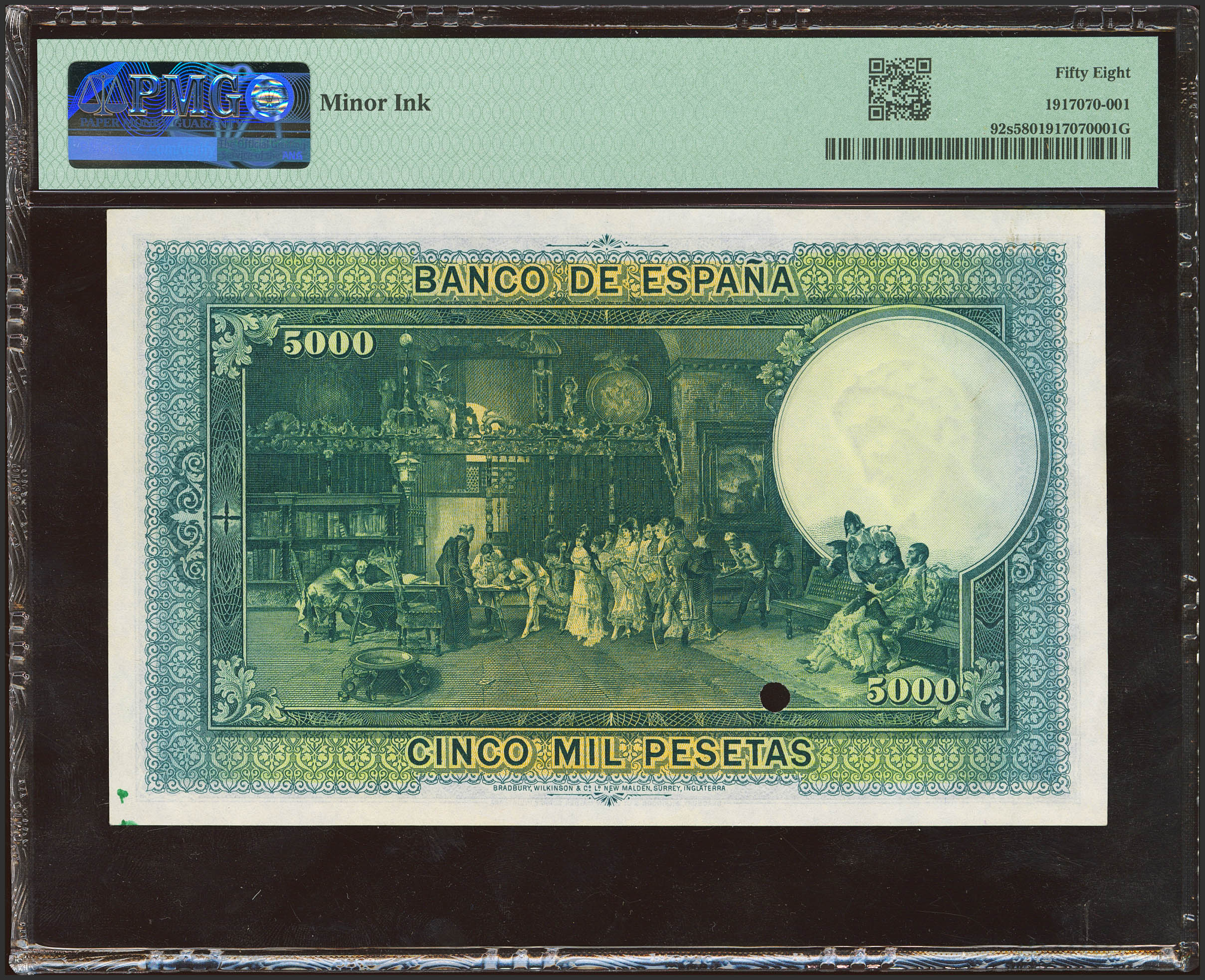 5000 Pesetas. 11 de Junio de 1938. Sin numeración y el sello de Bradbury sobre el espacio destinado a la firma del cajero. (Edifil 2023: NE35M, Pick: 92). Extraordinariamente raro y muy espectacular, en total no se conocen más de diez ejemplares y todos ellos en las fases previas a la emisión definitiva que nunca llegó a imprimirse, sin duda estamos ante el billete más icónico del siglo XX junto al de "La Dama de Elche", pero este último no tan raro como el "Fortuny". EBC++. Encapsulado PMG58 (minor ink) (para hacernos idea de la rareza, a fecha 1 de Marzo, este billete es el único calificado en PMG) (a título informativo reseñamos que este ejemplar que procede del archivo Bradbury no presenta la marca de su montaje como la mayoría de billetes procedentes del archivo que si la presentan).El primer intento de emitir un billete de un valor por encima del límite legal de 1000 pesetas data de 1938, durante la Guerra Civil Española, en territorio republicano. La necesidad de poner en circulación denominaciones altas fue cubriéndose mediante la puesta en emisión de los billetes de 500 y 1000 pesetas de 1928, así como las 500 pesetas de 1935 de Hernán Cortés. Sin embargo, la descontrolada inflación republicana exigía mover el listón hasta valores nunca vistos. Es por ello que el Banco de España, trasladado ya a Barcelona, encargó en Abril de 1938 la fabricación de un billete de 5000 pesetas a la casa inglesa Bradbury, Wilkinson and Cº, con la que España venía trabajando desde 1906.El anverso de ese billete muestra un retrato del genial pintor catalán de estilo orientalista, Mariano Fortuny, pintado por él mismo hacia 1873, poco antes de morir. El reverso del billete reproduce el cuadro “La Vicaría”, pintado en 1870 por el propio Fortuny y cuyo grabado en el billete debemos al británico Edward T. Dawson.Este ejemplar de 5000 pesetas de 1938 que mostramos procede directamente del archivo de la casa inglesa Bradbury, Wilkinson and Cº, donde servía como referencia y control.