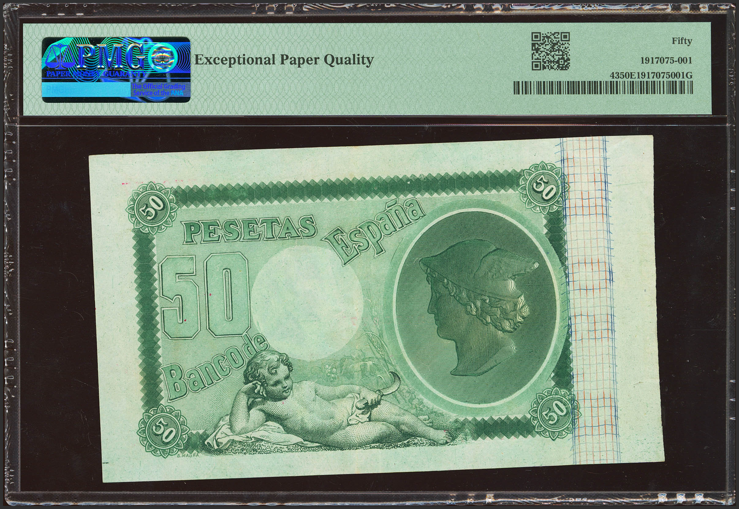 50 Pesetas. 24 de Julio de 1893. Sin serie. (Edifil 2023: 301, Pick 43). Raro, especialmente sin reparaciones y en esta excepcional calidad, apresto original. EBC. Encapsulado PMG50EPQ (para hacernos idea de la rareza, a fecha 1 de Marzo de 2024, este billete es el segundo mejor calificado junto a otro billete en PMG).