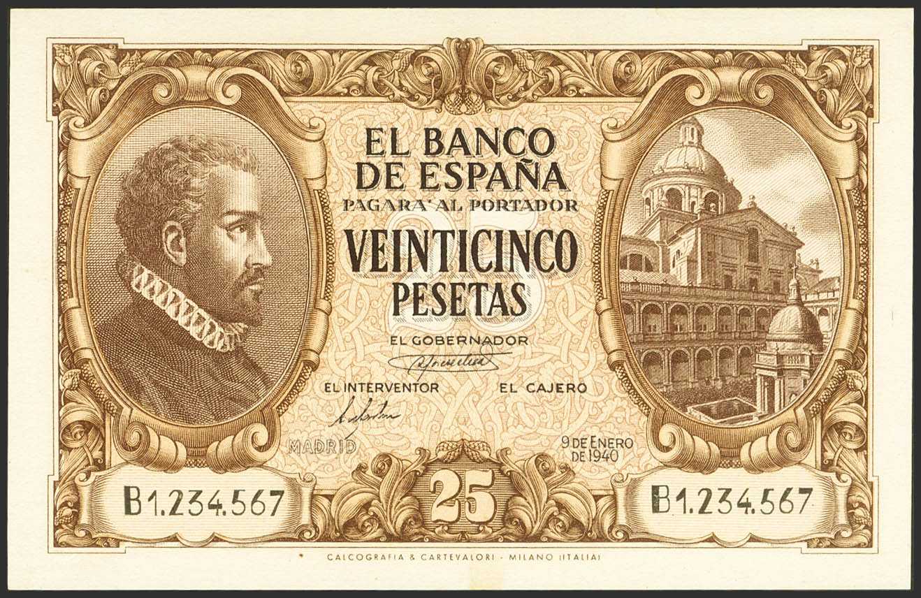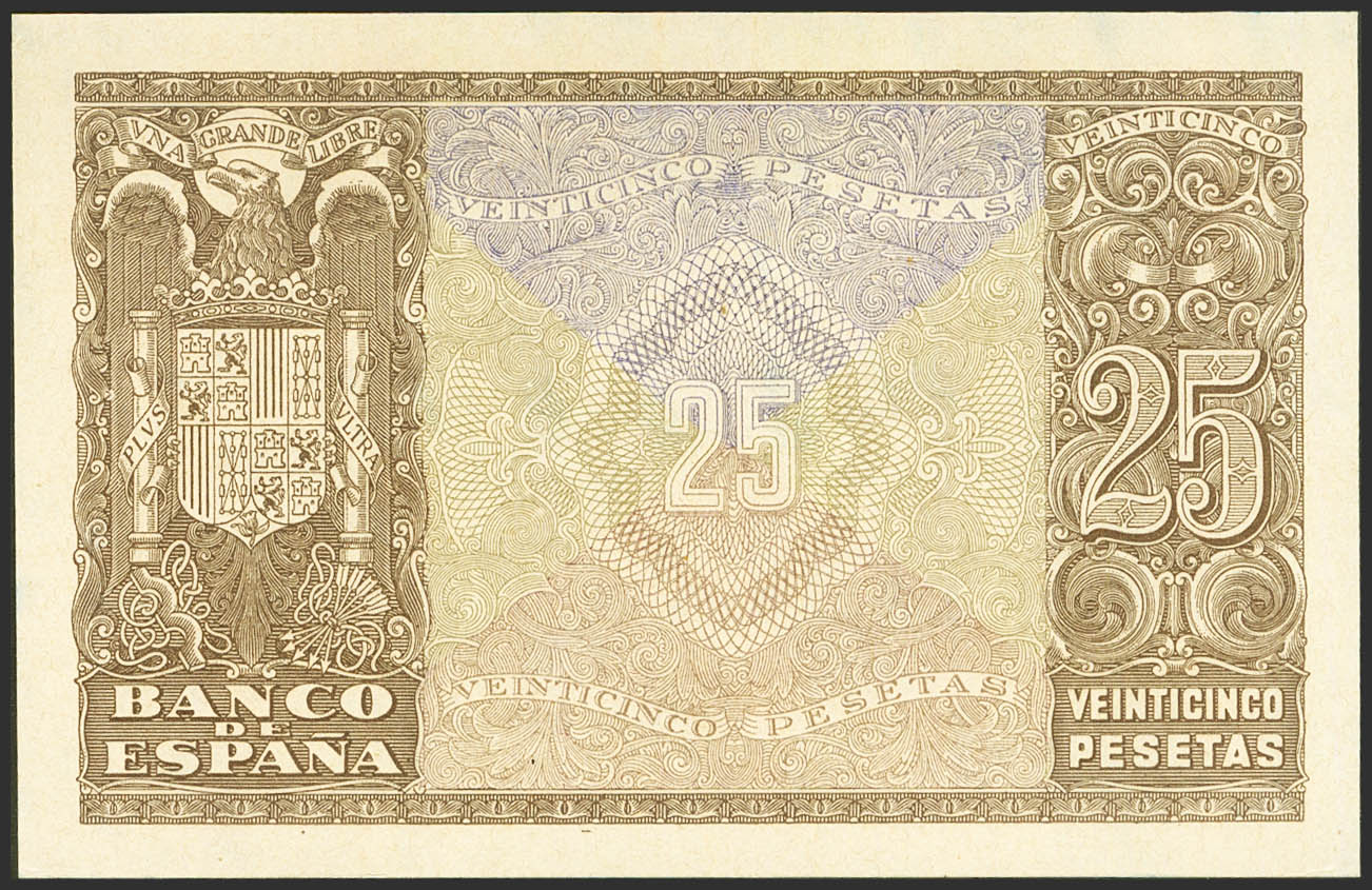 25 Pesetas. 9 de Enero de 1940. Prueba del anverso y reverso con un color no definitivo y con la numeración B1234567 (números consecutivos). (Edifil 2023: 438P, 438Pa). Extraordinariamente rara, previamente montado sobre cartulina. SC--.