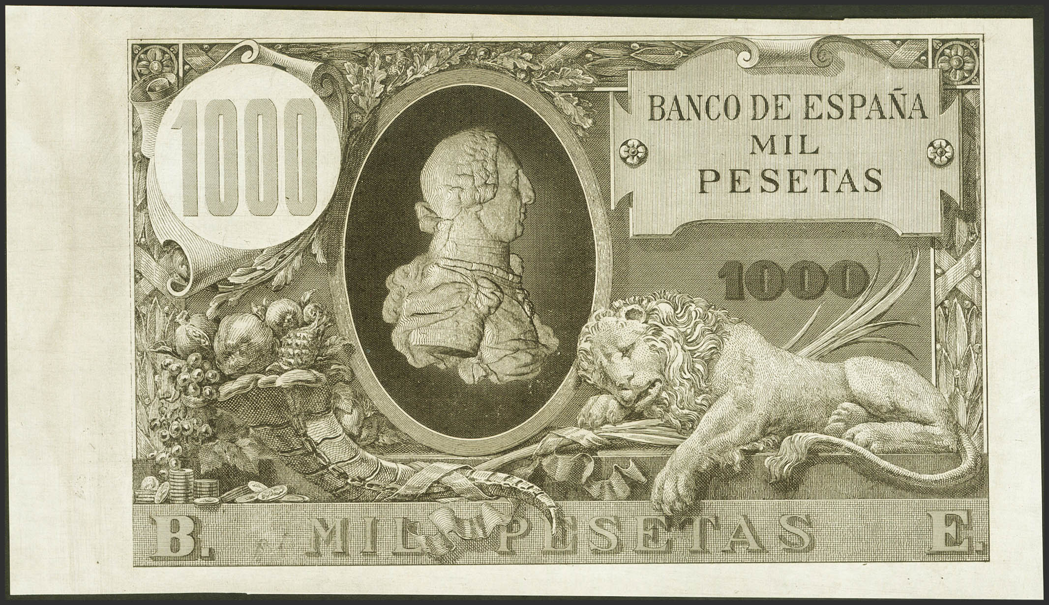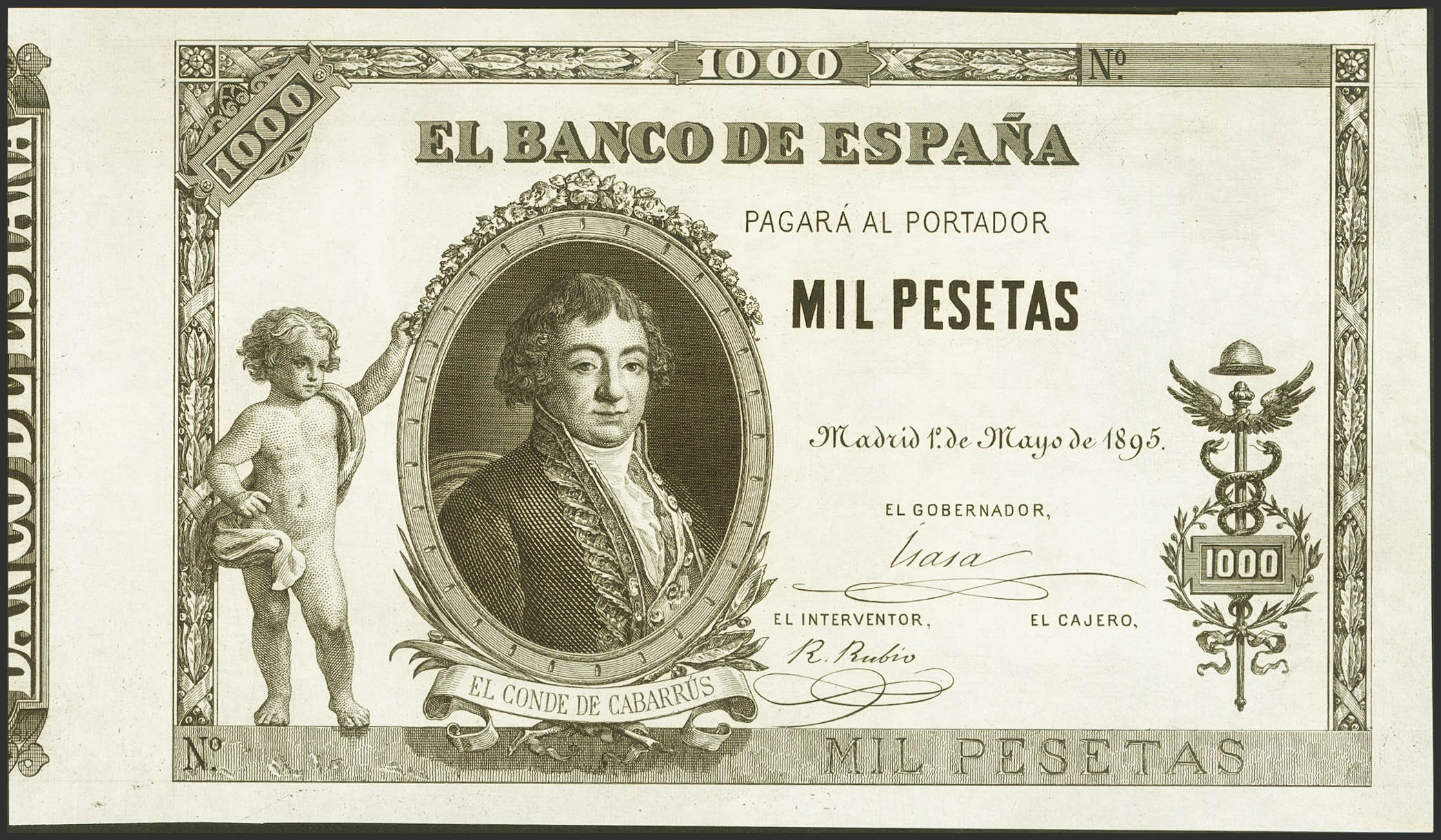 1000 Pesetas. 1 de Mayo de 1895. Prueba calcográfica (sin fondos), de anverso y reverso, sin numeración y sin firma de cajero. (Edifil 2023: 303Pa). SC-.