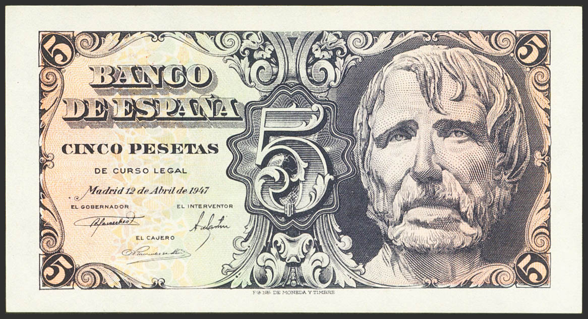 5 Pesetas. 12 de Abril de 1947. Serie A. (Edifil 2023: 454a, Pick: 134a). Apresto original. SC.