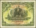 1000 Pesetas. 15 de Julio de 1907. Sin serie y sellos en seco GOBIERNO PROVISIONAL DE LA REPUBLICA / 14 DE ABRIL DE 1931 y ESTADO ESPAÑOL / BURGOS. (Edifil 2023: 415A, Pick 66b). Puntitos de grapa en el margen superior. MBC-.