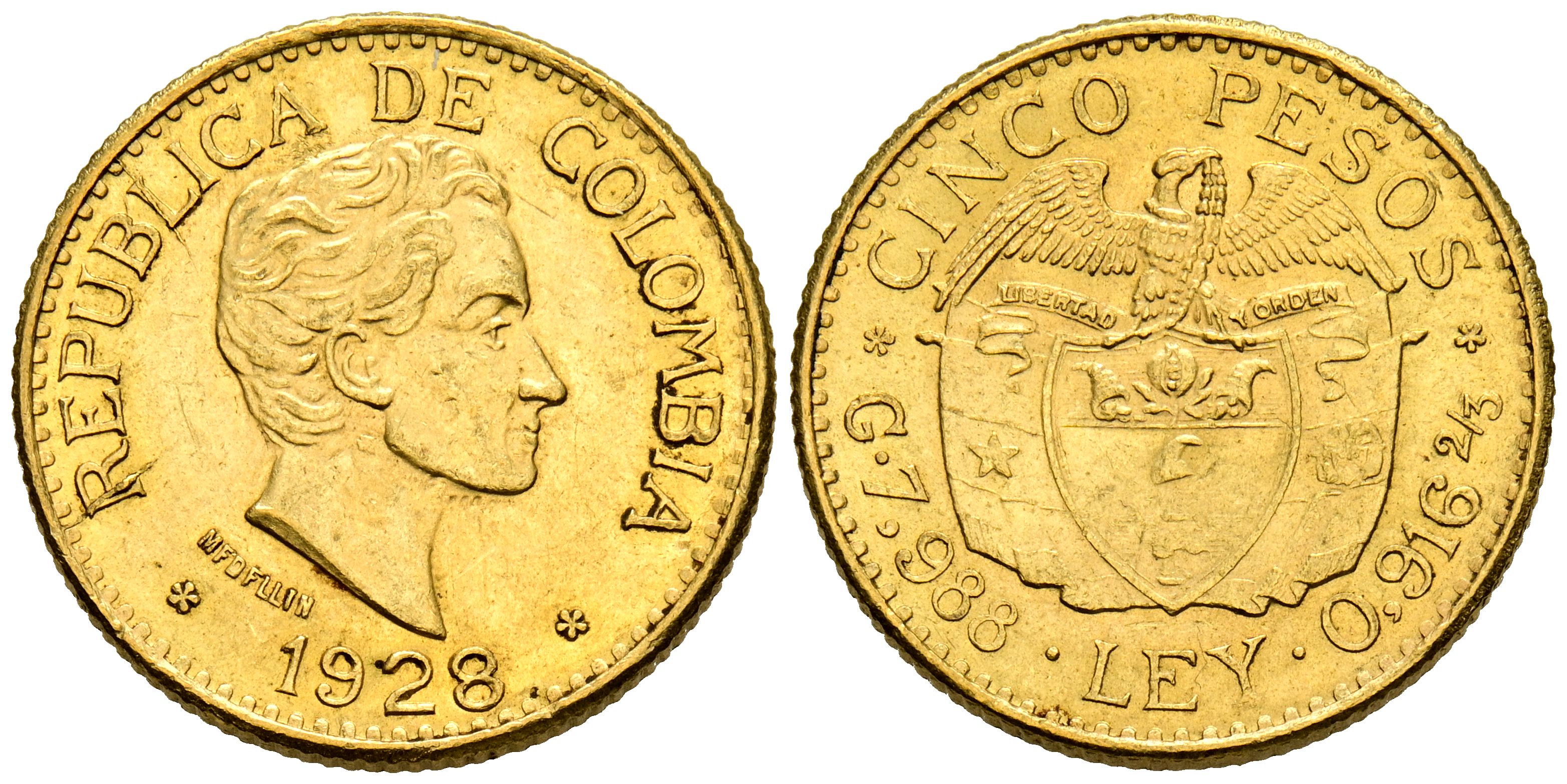 COLOMBIA. 5 Pesos. (Au. 8,00g/22mm). 1928. (Km#201). EBC.