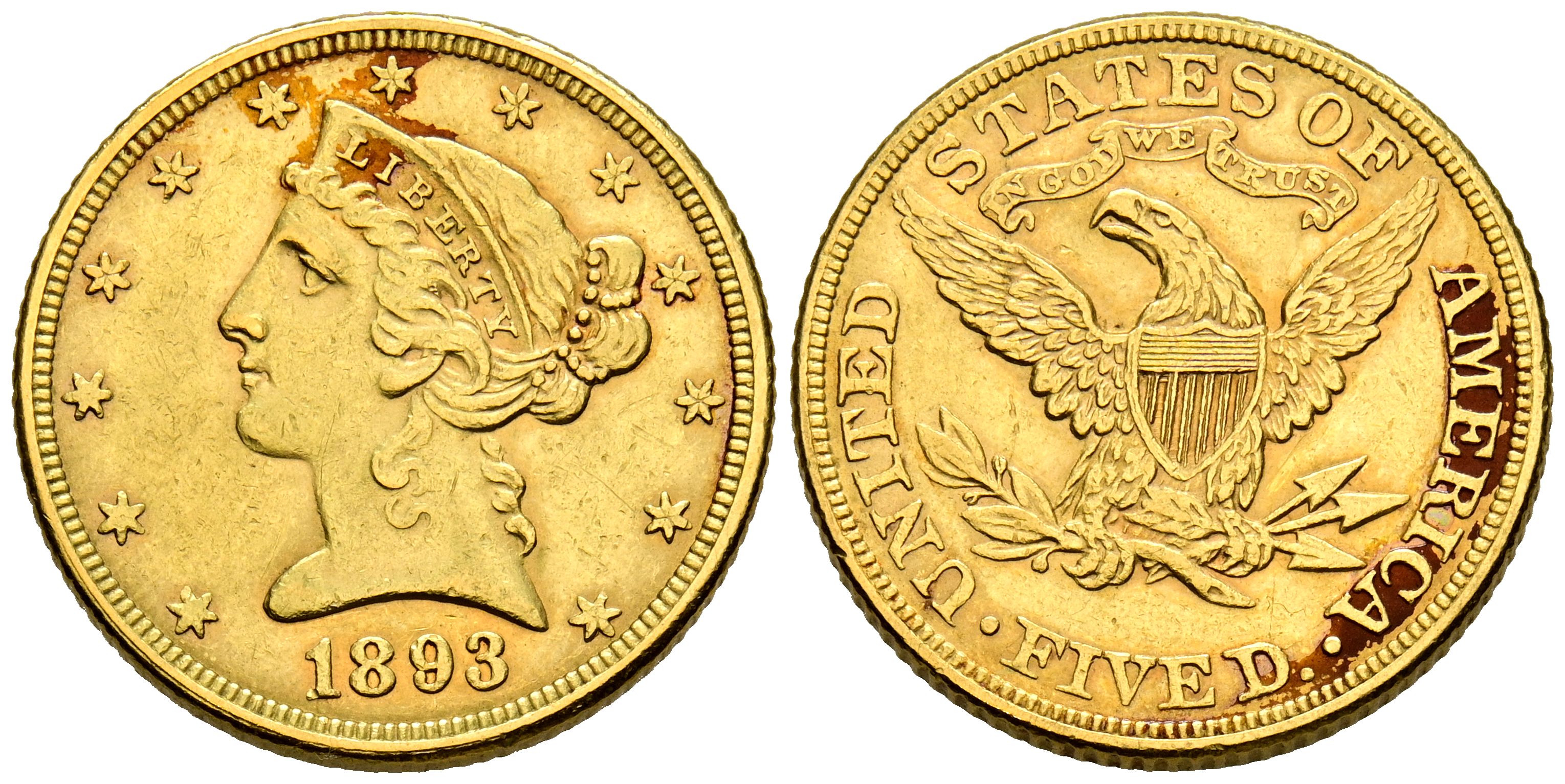 ESTADOS UNIDOS. 5 Dólares. (Au. 8,34g/21mm). 1893. Philadelphia. (Km#101). MBC.