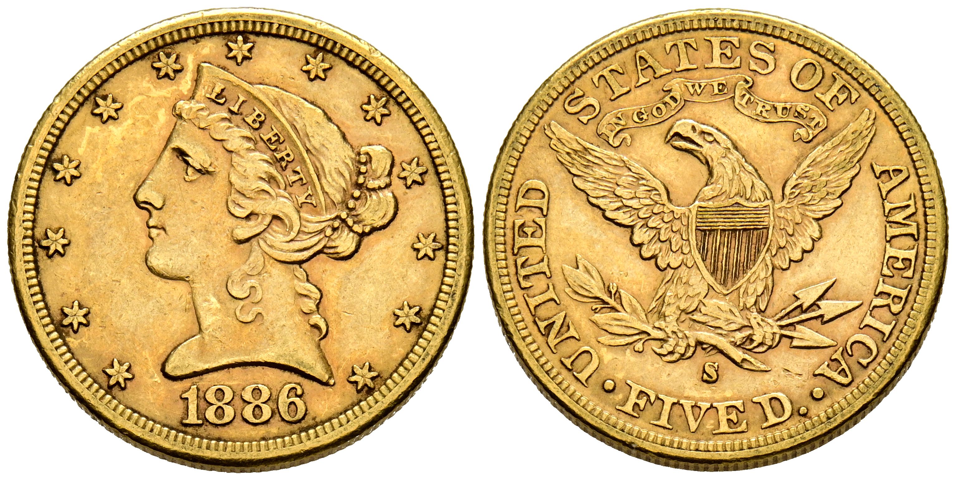ESTADOS UNIDOS. 5 Dólares. (Au. 8,34g/21mm). 1886. San Francisco S. (Km#101). MBC+.