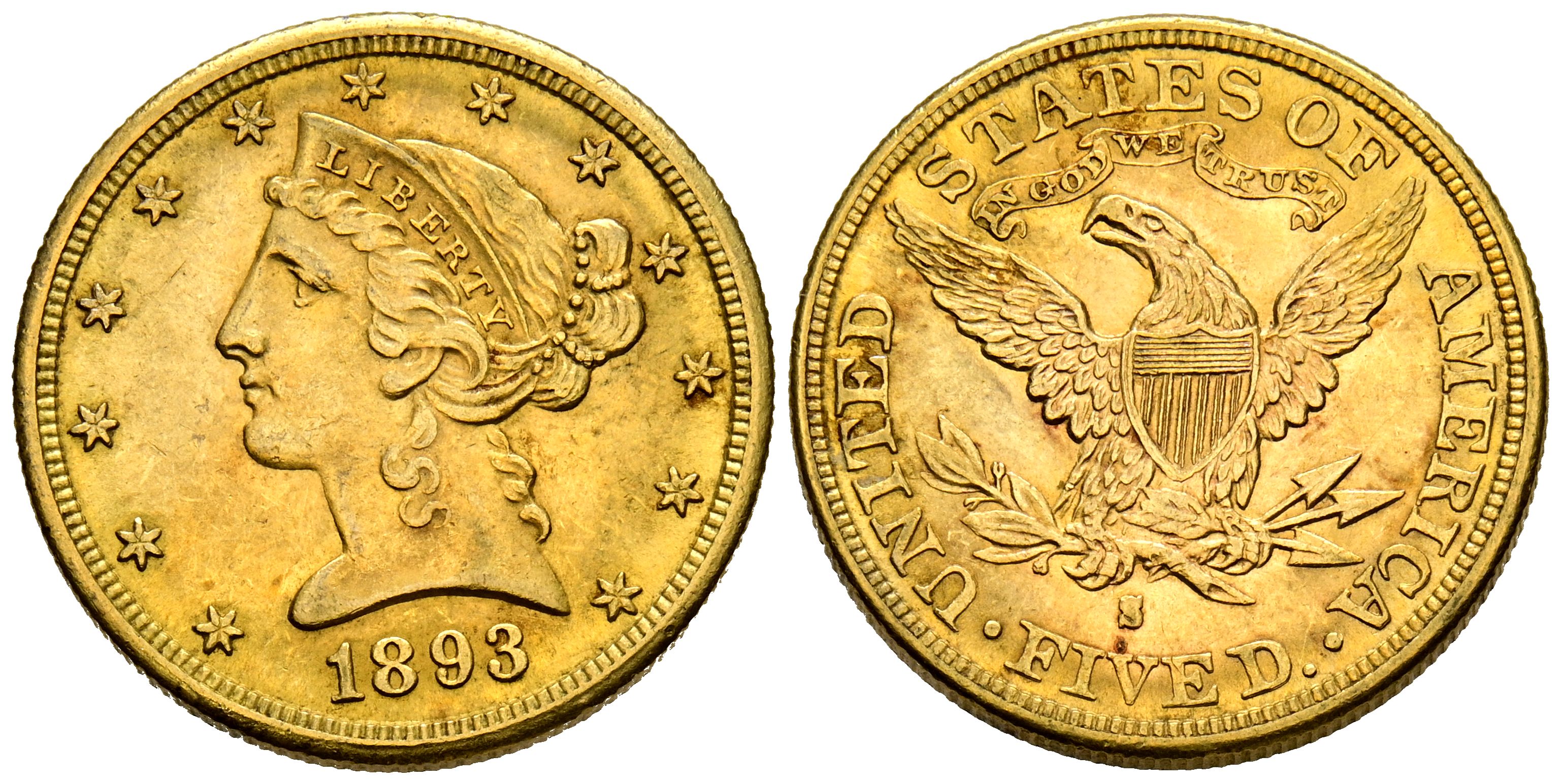 ESTADOS UNIDOS. 5 Dólares. (Au. 8,36g/21mm). 1893. San Francisco S. (Km#101). MBC+.