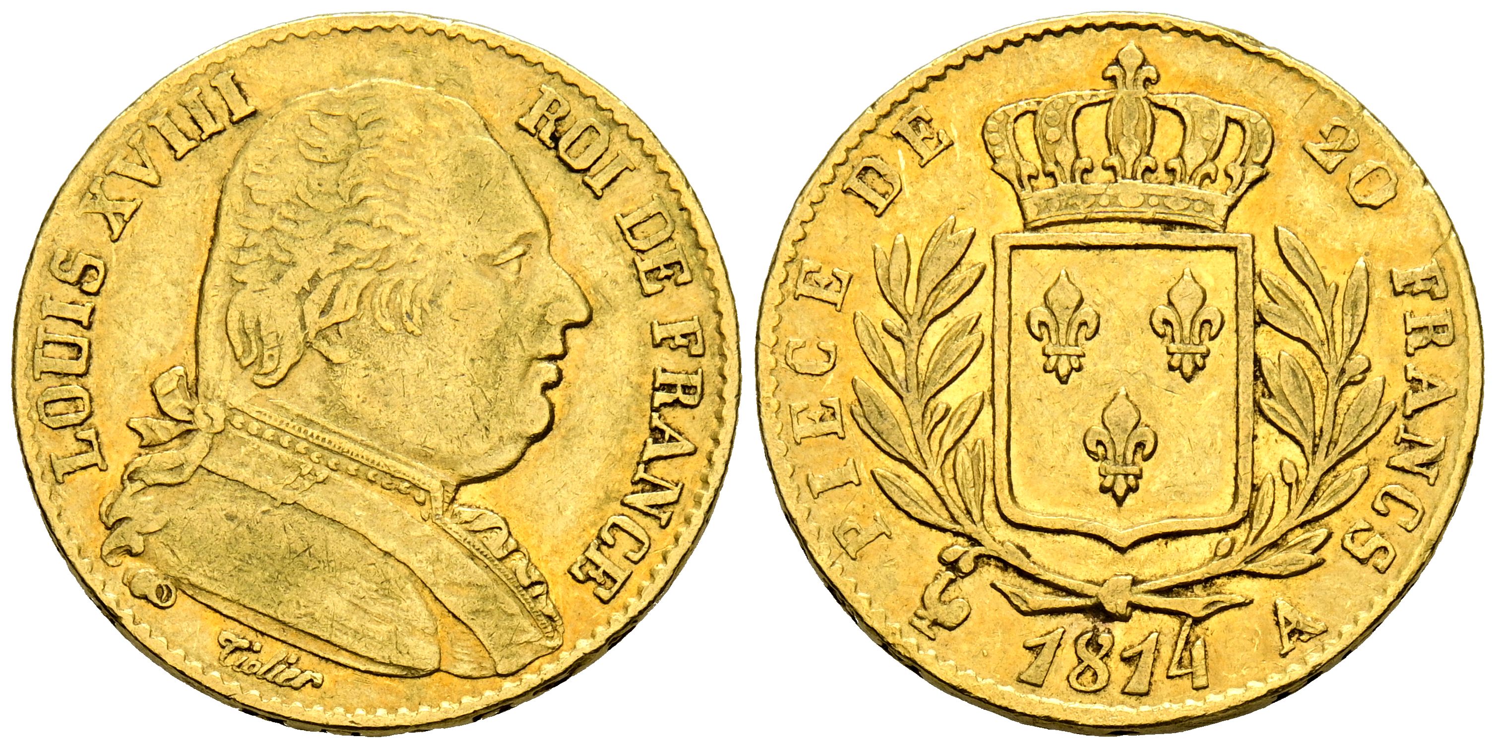 FRANCIA, Luis XVIII (1815-1824). 20 Francos. (Au. 6,42g/21mm). 1814. París A. (Km#712.1). MBC-.