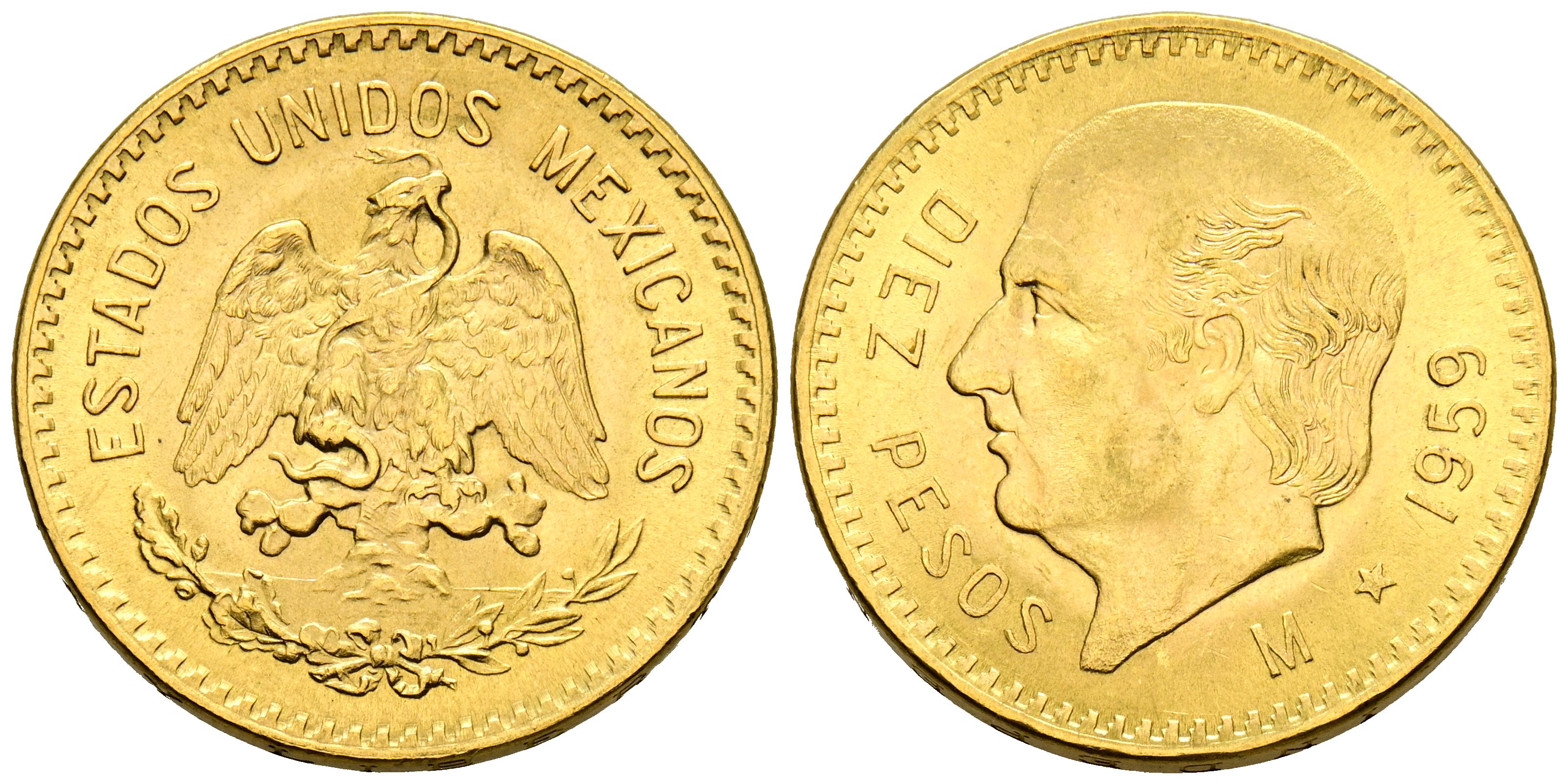 MÉXICO. 10 Pesos. (Au. 8,35g/23mm). 1959. México. (Km#473). Hidalgo. MBC+.