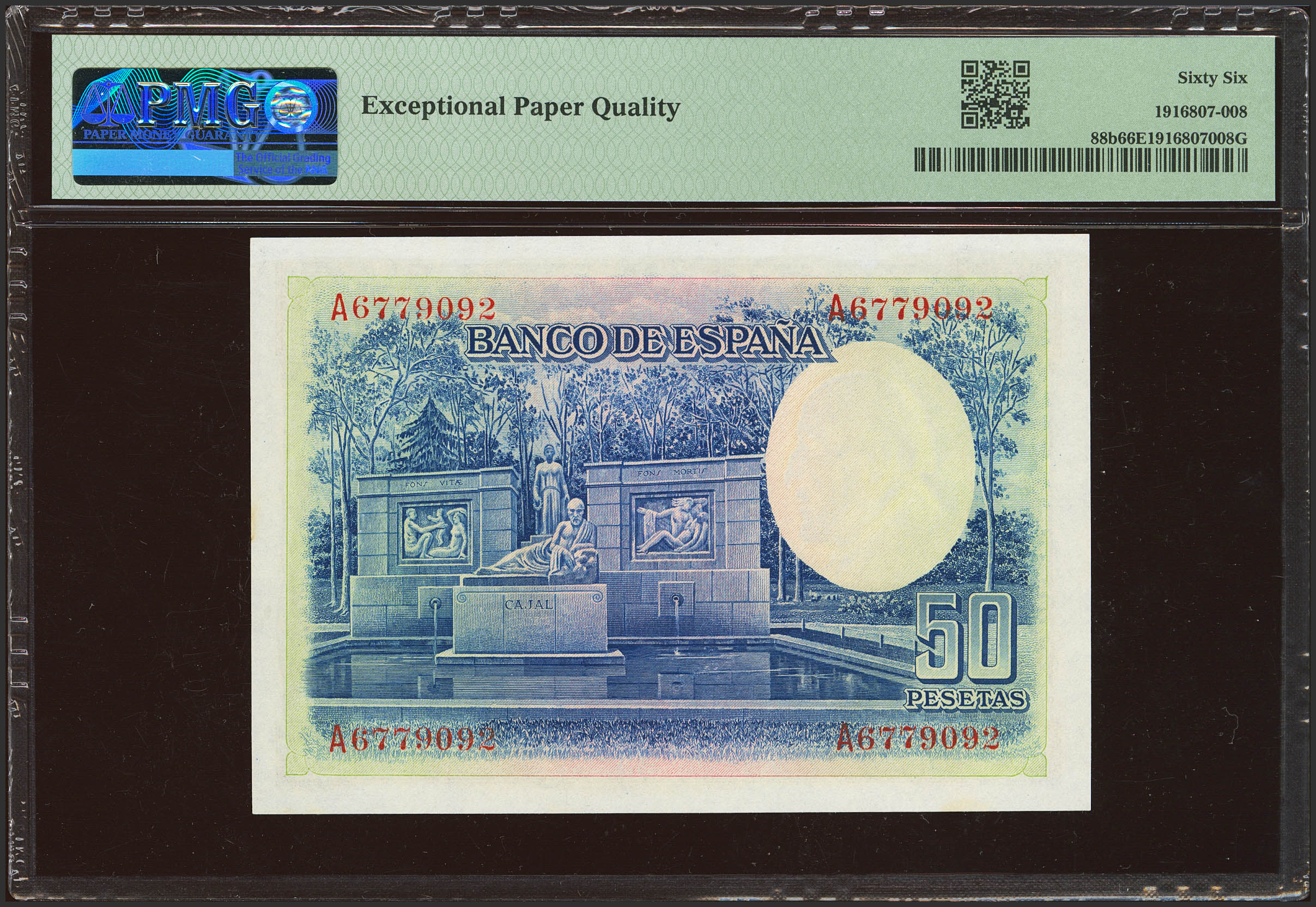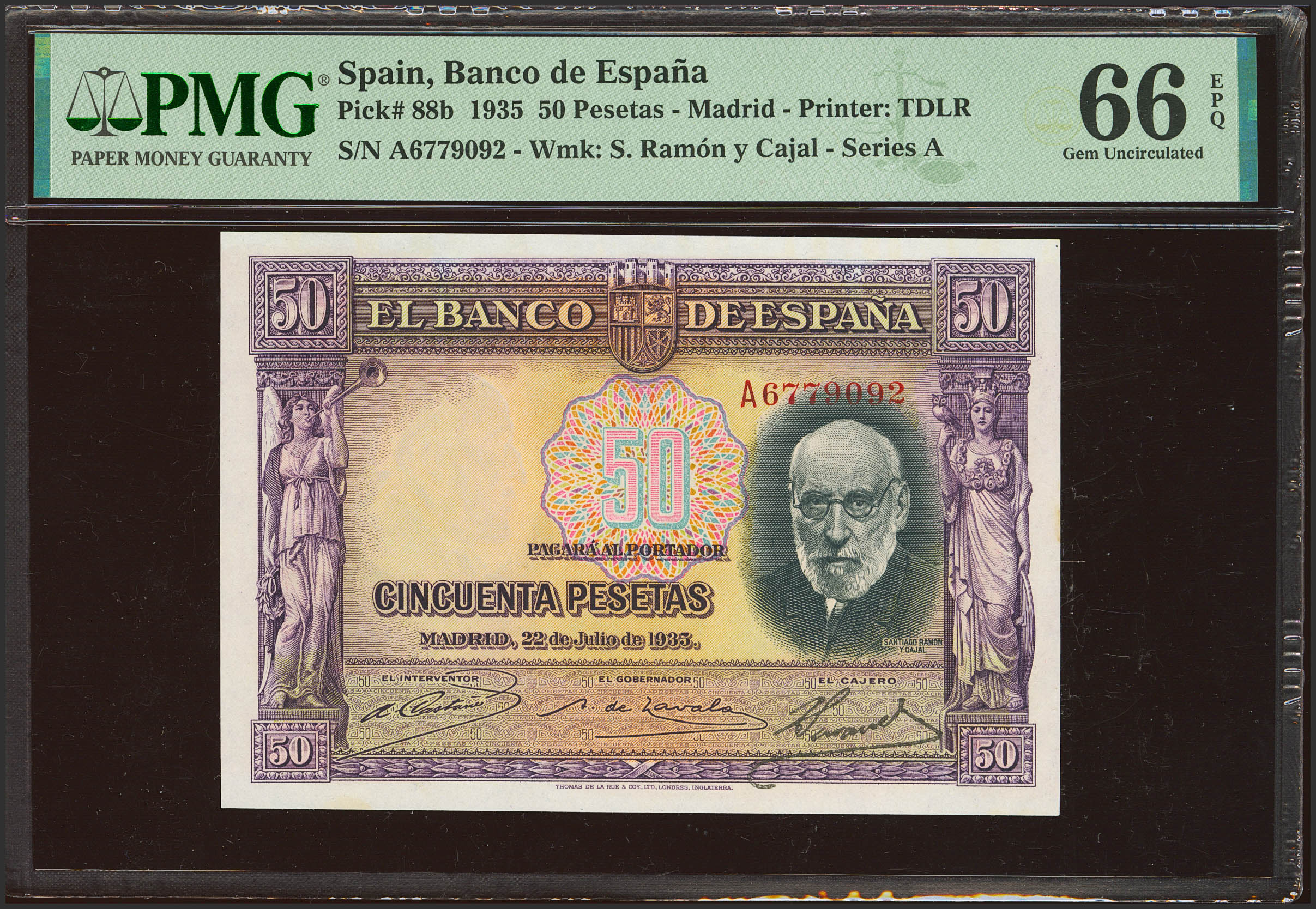 50 Pesetas. 22 de Julio de 1935. Serie A. (Edifil 2023: 366a, Pick: 88b). Apresto original. SC. Encapsulado PMG66EPQ.