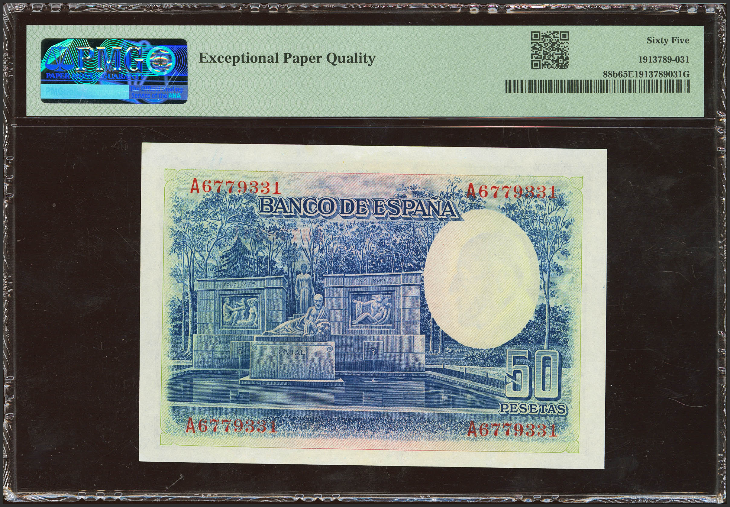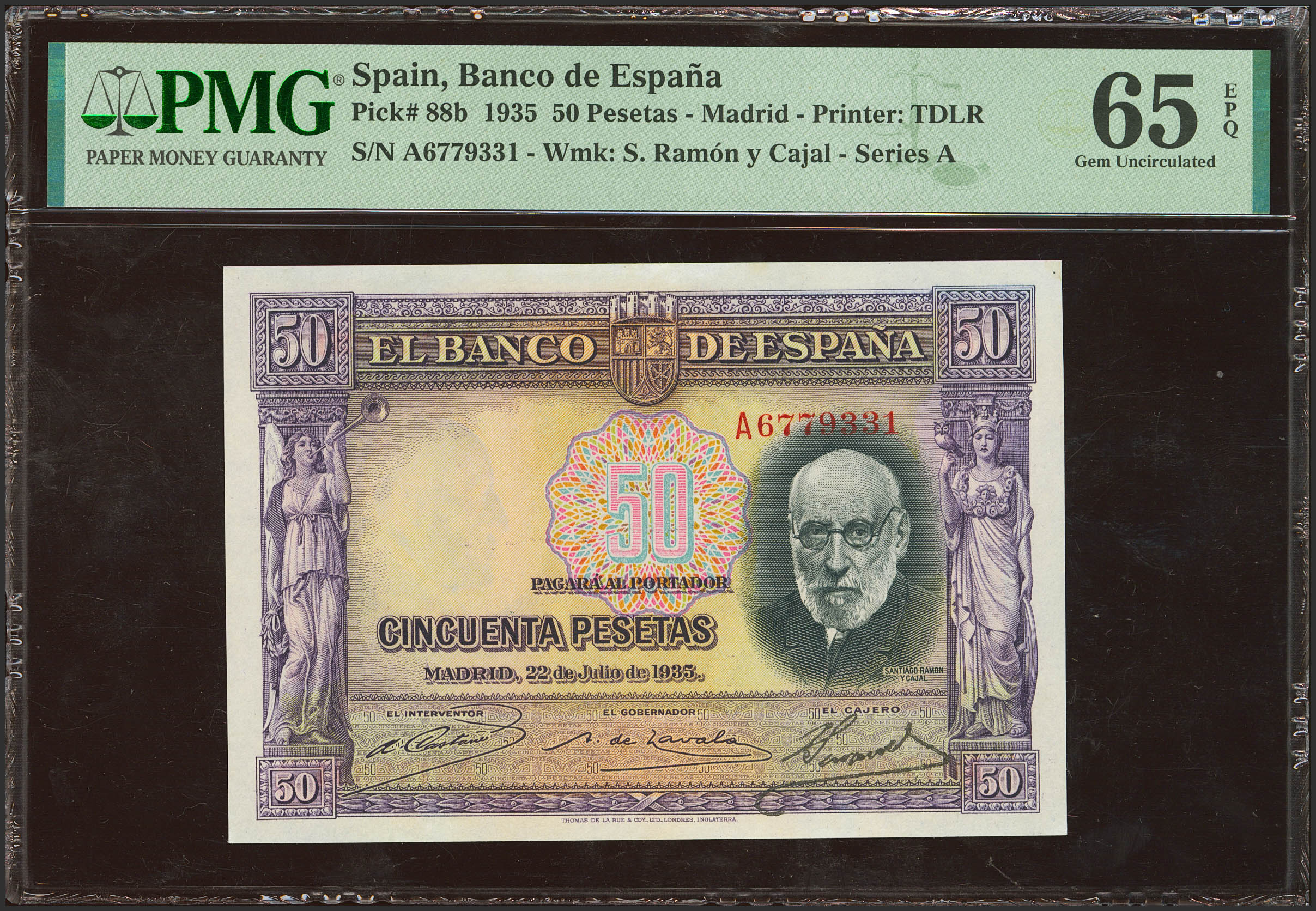 50 Pesetas. 22 de Julio de 1935. Serie A. (Edifil 2021: 366a, Pick: 88b). Apresto original. SC. Encapsulado PMG65EPQ.