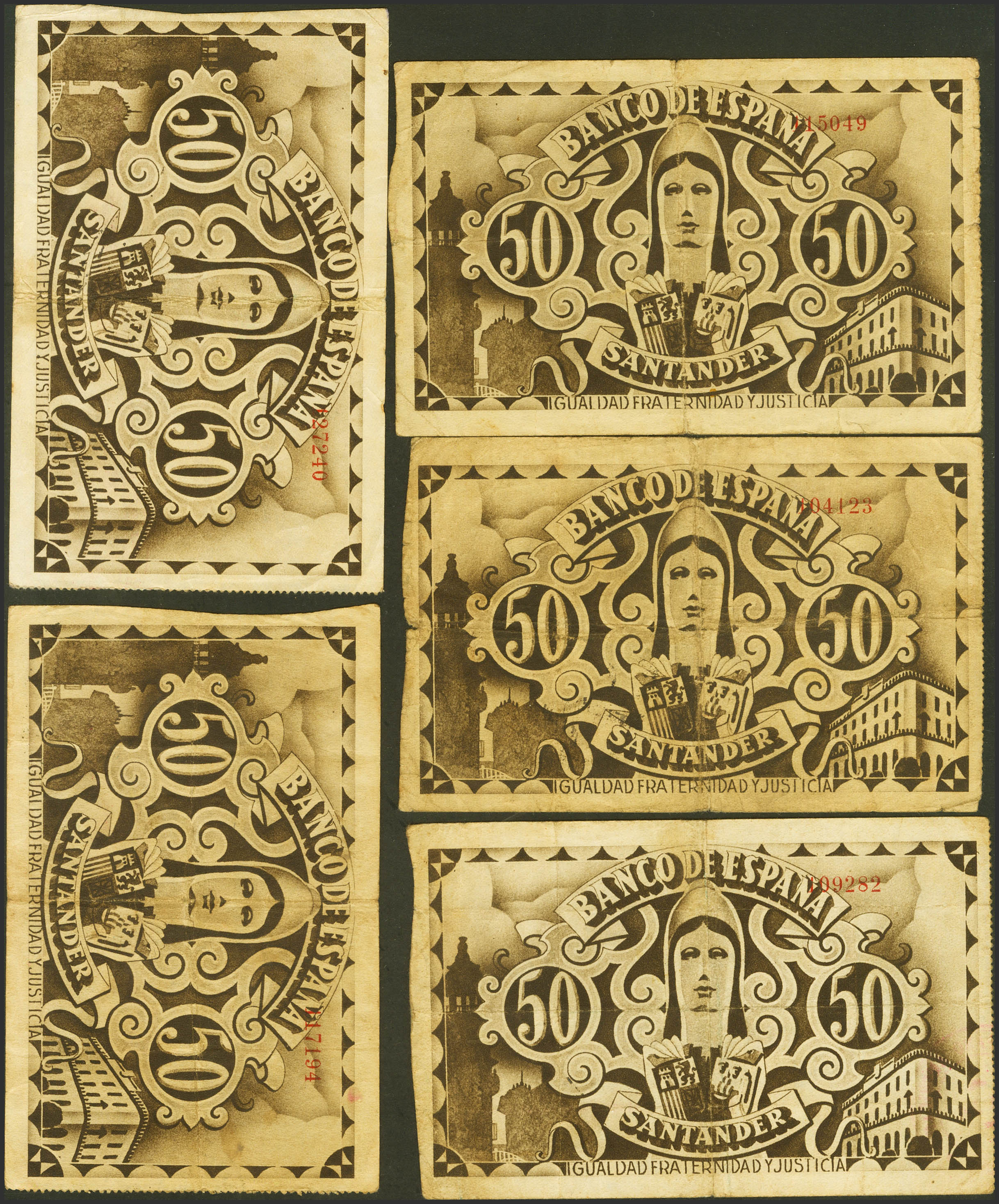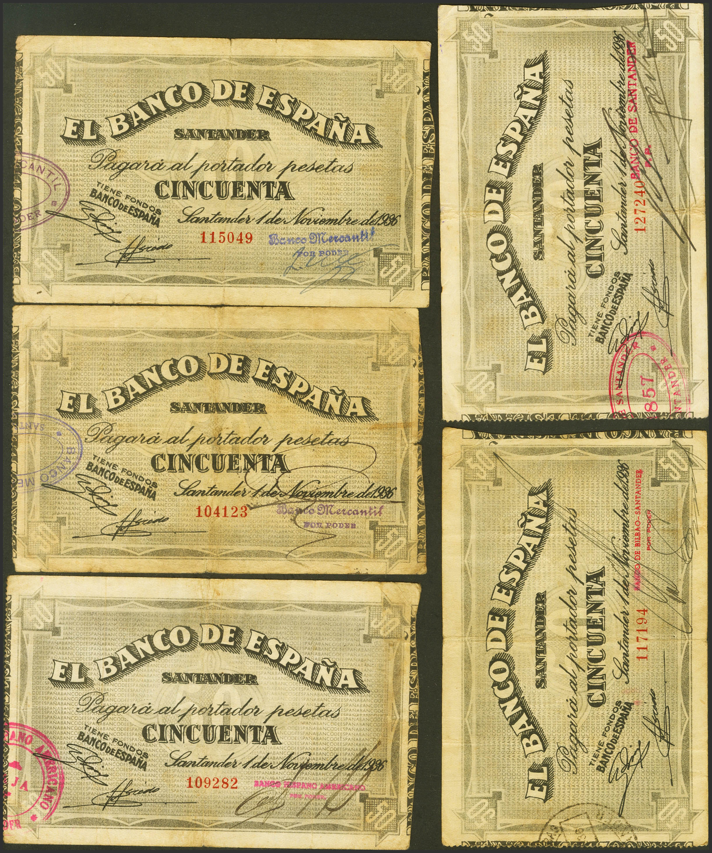 Conjunto de 5 billetes de 50 Pesetas del Banco de Santander, emitidos el 1 de Noviembre de 1936, todos ellos sin serie y con diversas antefirmas. (Edifil 2023: 378). MBC.