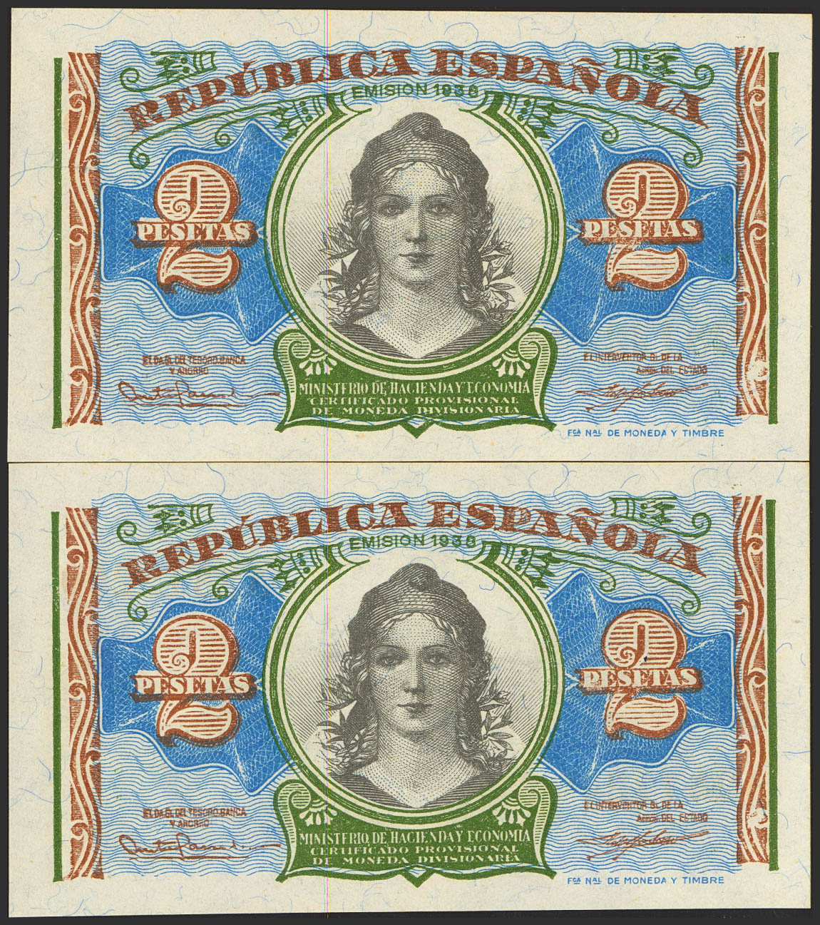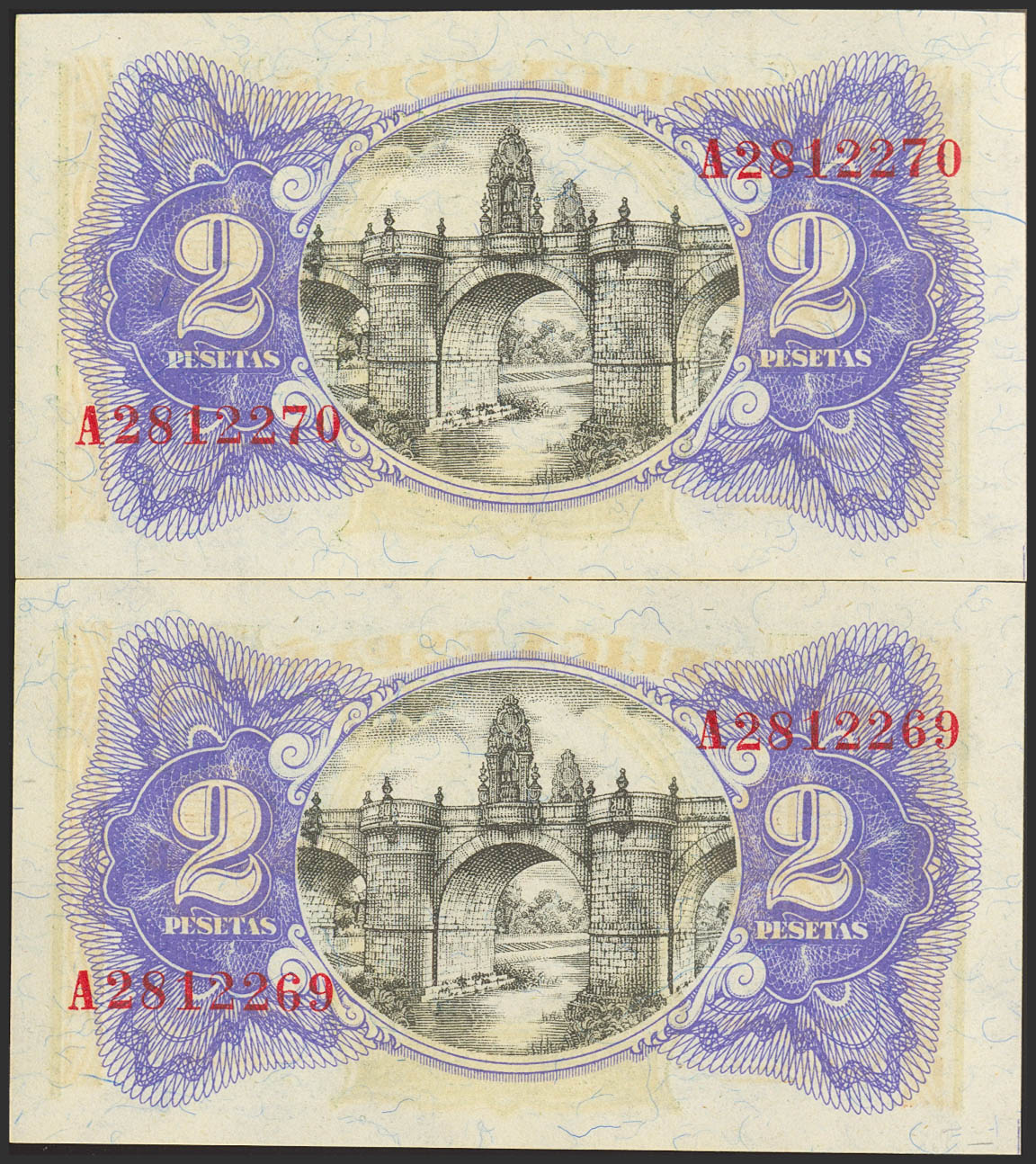 2 Pesetas. 1937. Ministerio de Hacienda. Pareja correlativa. Serie A. (Edifil 2023: 393). Apresto original. SC.