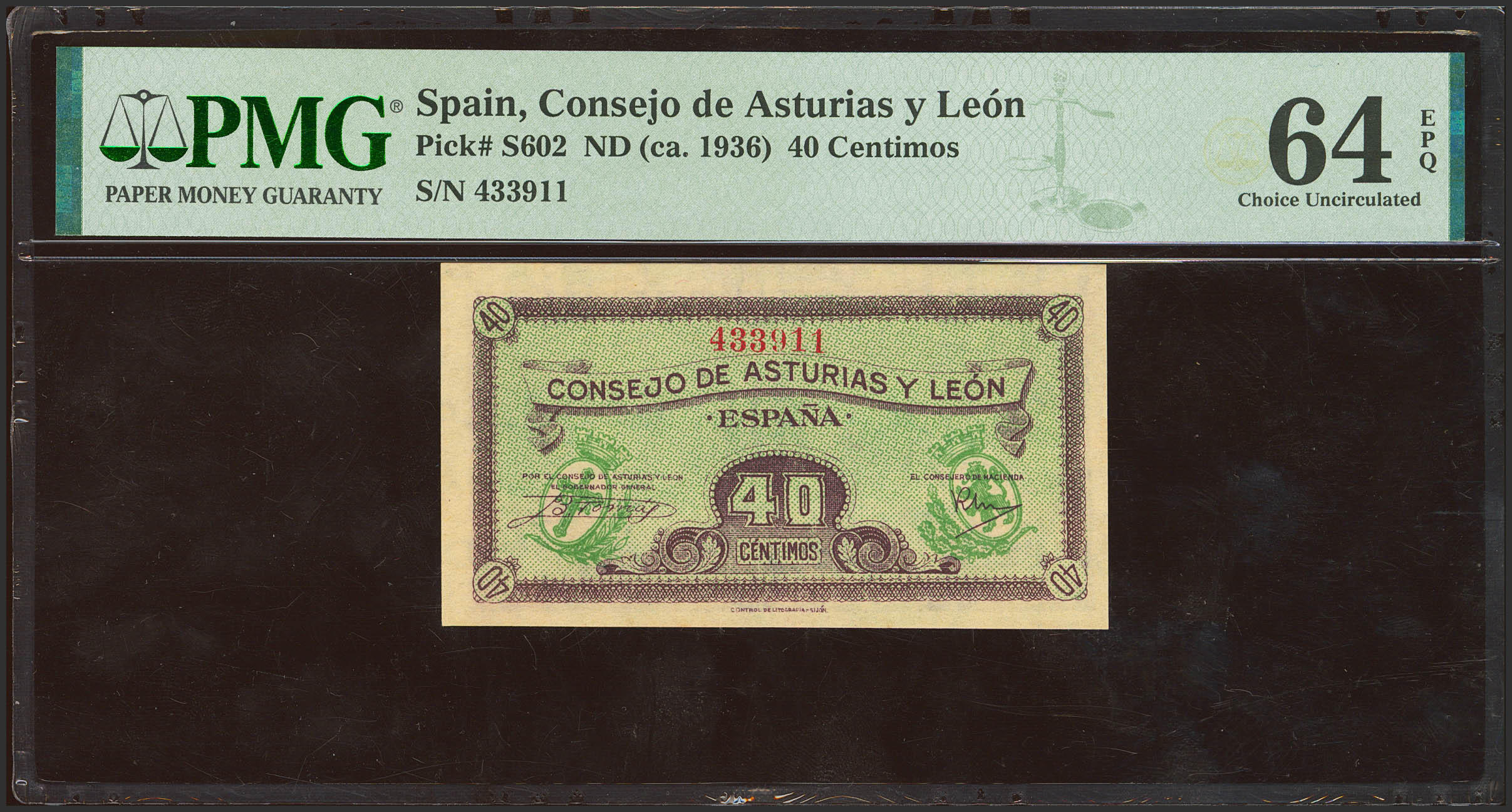 40 Céntimos. 1937. Asturias y León. Sin serie. (Edifil 2023: 395, Pick: S602). Apresto original. SC. Encapsulado PMG64EPQ.