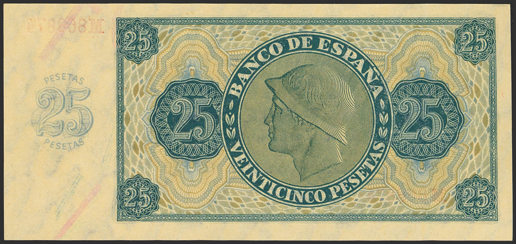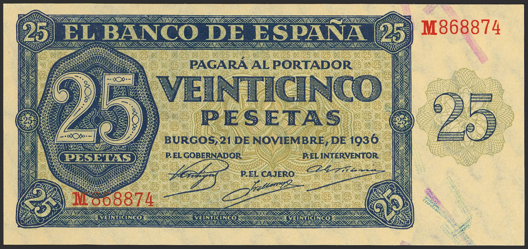 25 Pesetas. 21 de Noviembre de 1936. Serie M. (Edifil 2023: 419a). Conserva todo su apresto original. SC.