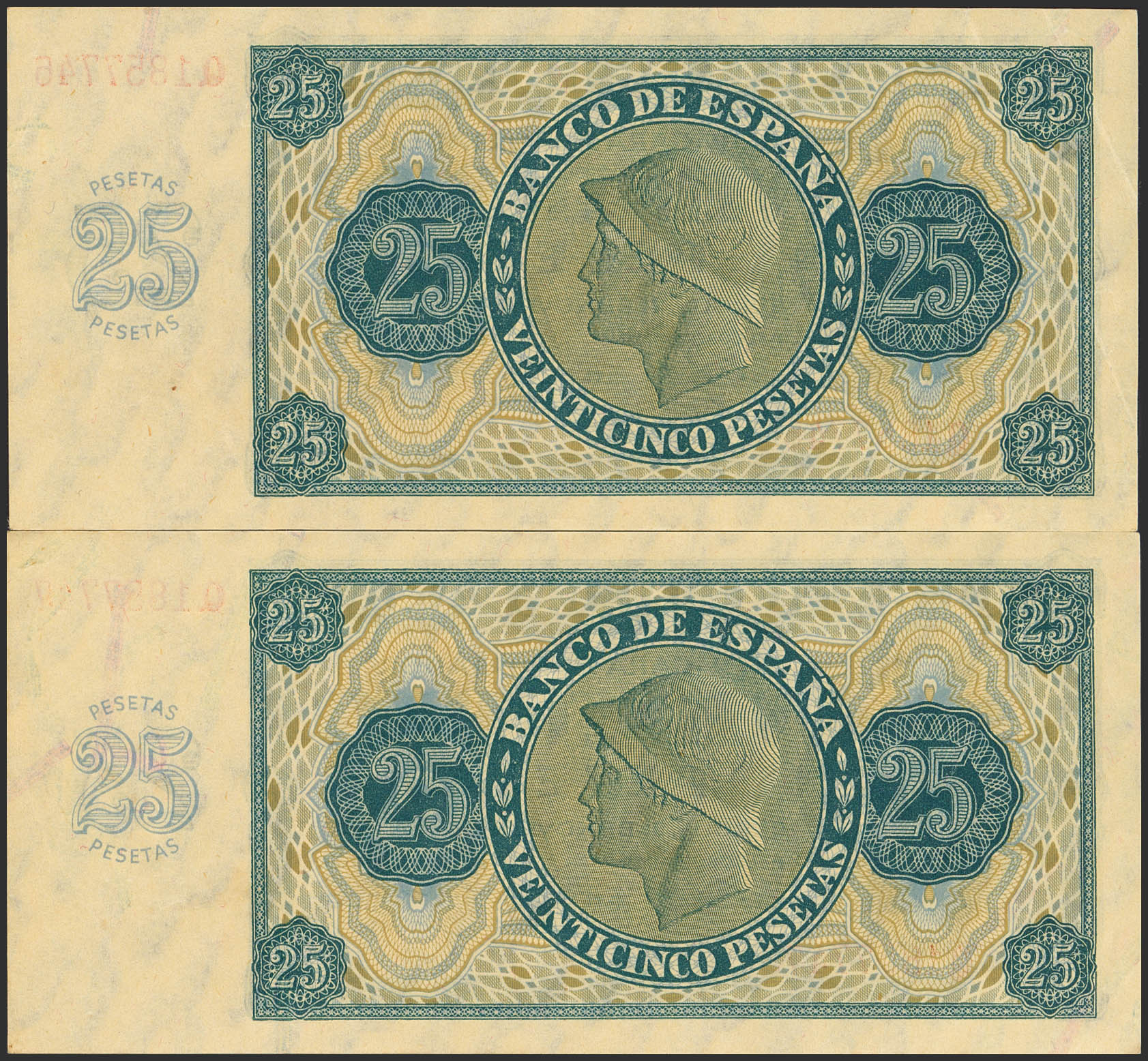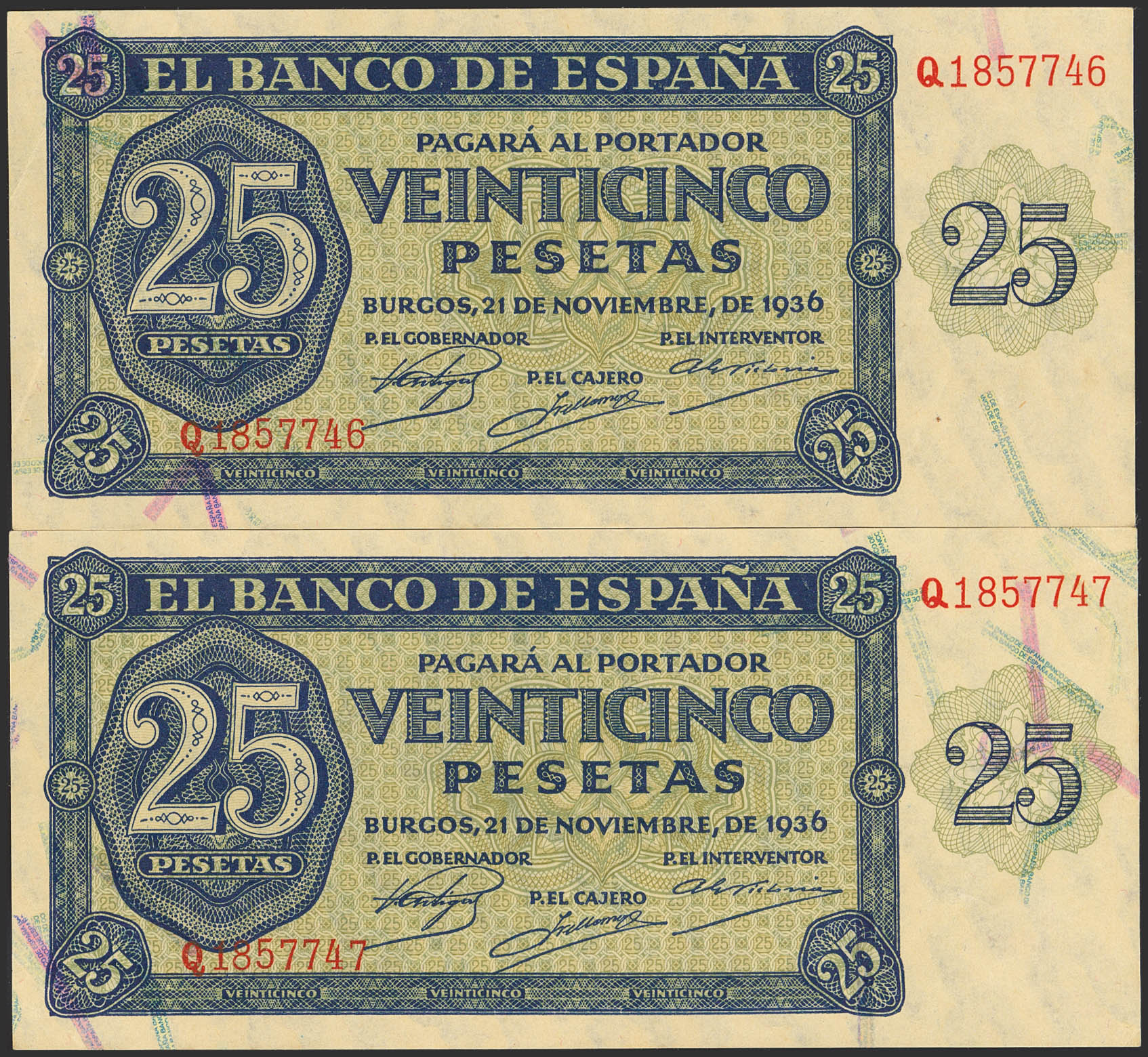 25 Pesetas. 21 de Noviembre de 1936. Pareja correlativa. Serie Q. (Edifil 2023: 419a). Apresto original. SC-.