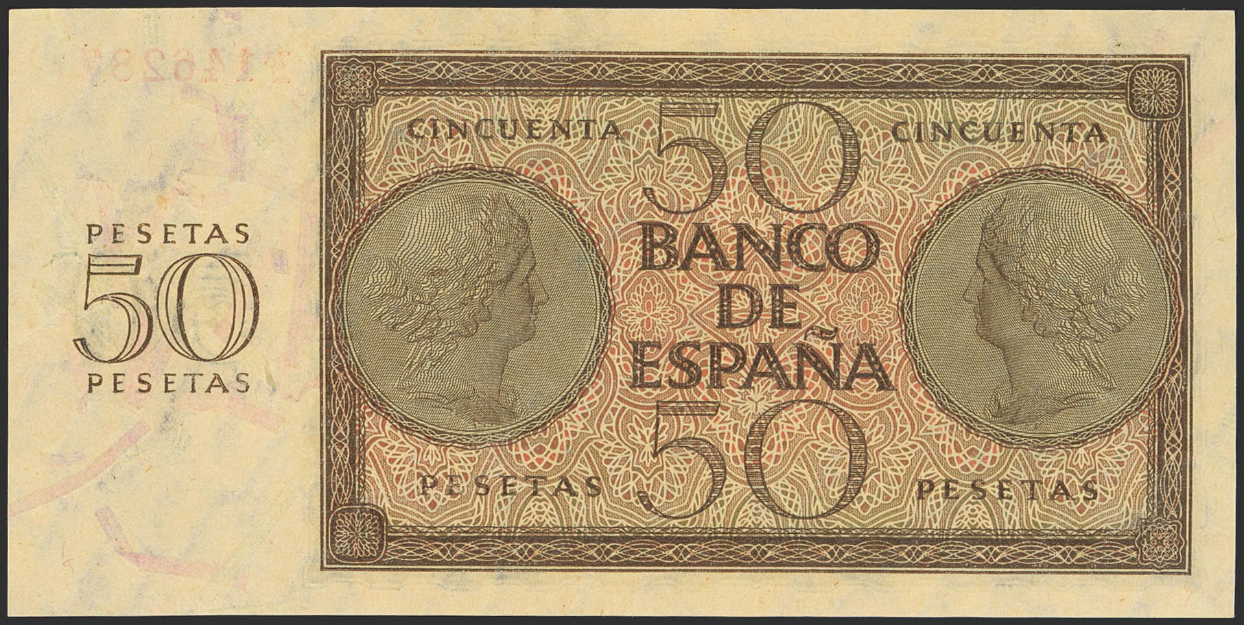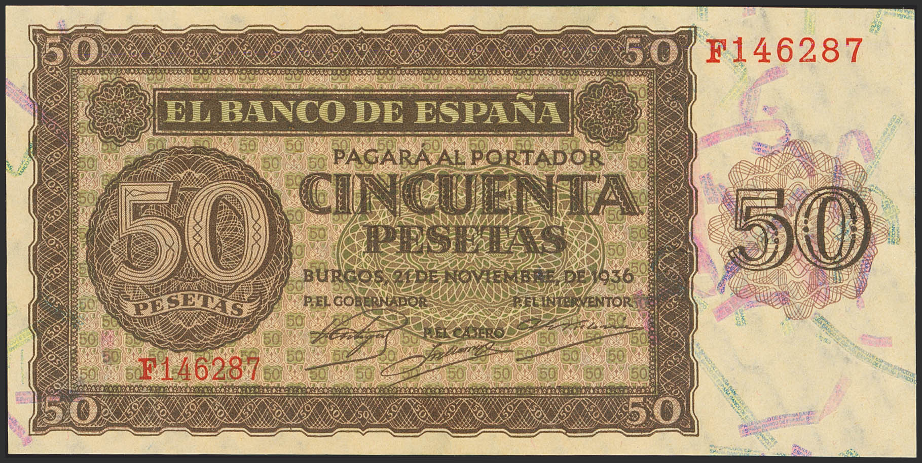 50 Pesetas. 21 de Noviembre de 1936. Serie F. (Edifil 2023: 420a). Raro en esta excepcional calidad, conserva parte de su apresto original. SC-.
