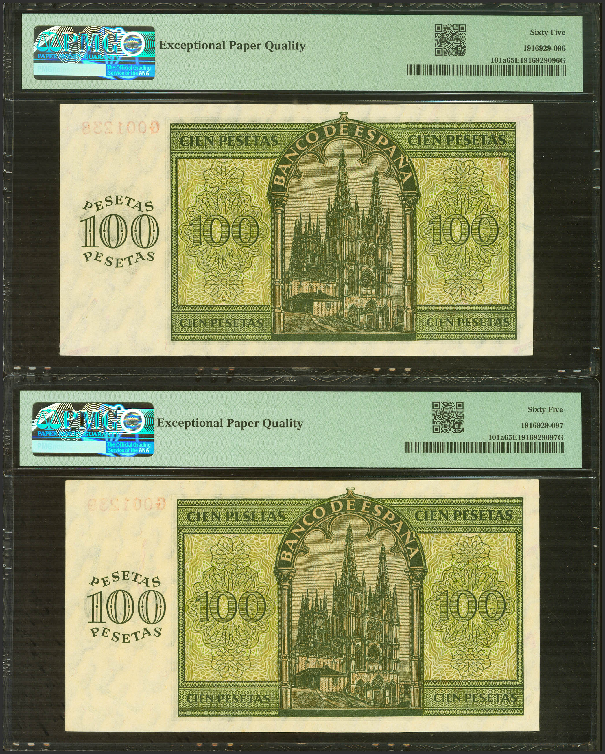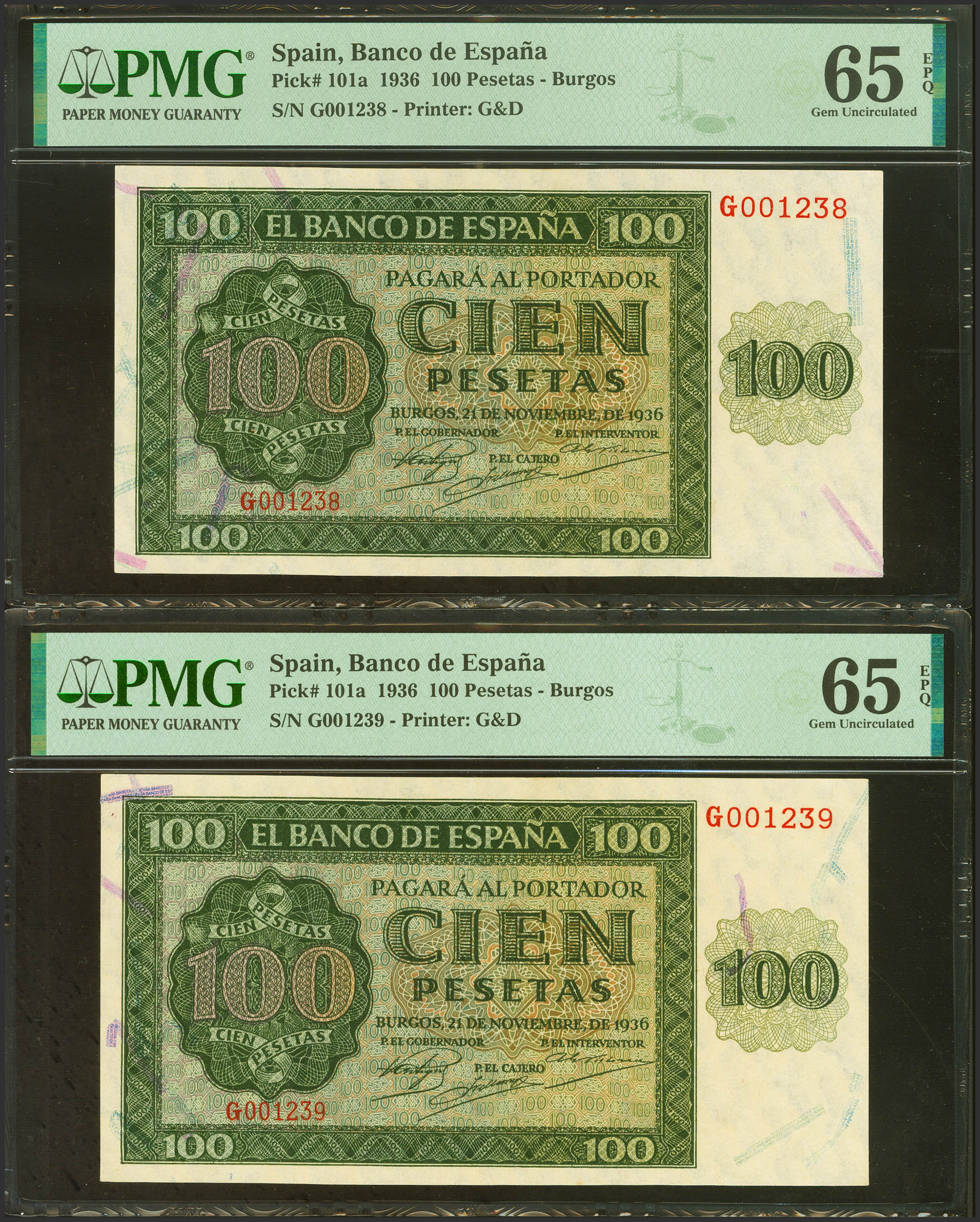 100 Pesetas. 21 de Noviembre de 1936. Pareja correlativa. Serie G. (Edifil 2023: 421a, Pick: 101a). Inusual, apresto original. SC. Encapsulados PMG65EPQ, ambos.
