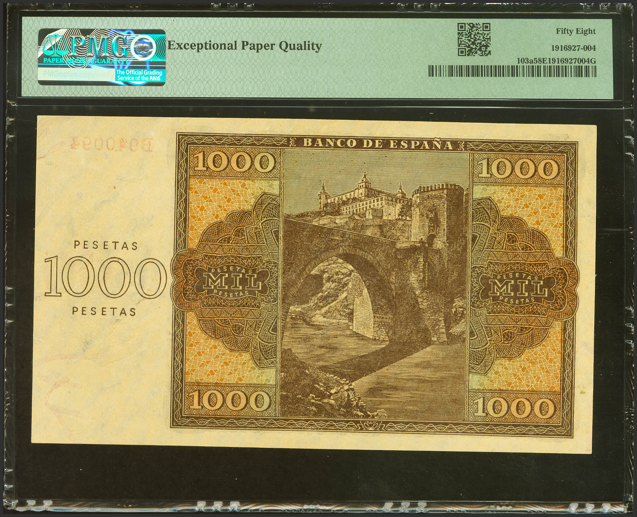 1000 Pesetas. 21 de Noviembre de 1936. Serie B. (Edifil 2023: 423a, Pick: 103a). Muy raro en esta excepcional calidad, apresto original. EBC+++. Encapsulado PMG58EPQ. (este billete no presenta doblez central, sólo unas pequeñas arruguitas, esta ha sido la razón de PMG de calificarlo con 58EPQ, procede de la subasta de Martí Hervera del 9 de Noviembre de 2024 vendido por 2700 euros más las correspondientes comisiones, entonces fue calificado con un SC con la mención de las arruguitas).