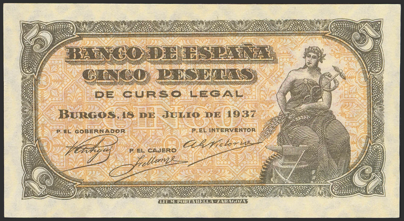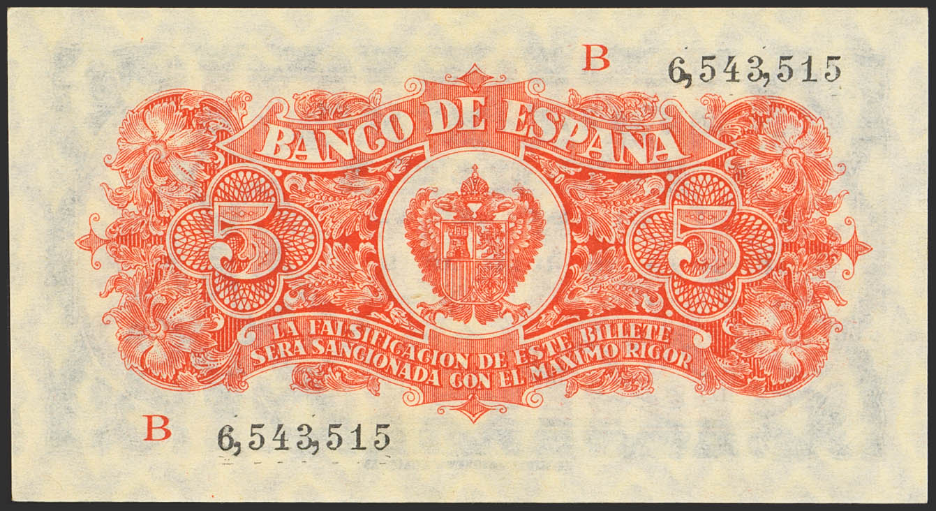 5 Pesetas. 18 de Julio de 1937. Serie B. (Edifil 2023: 424a, Pick: 106a). Inusual en esta excepcional calidad, apresto original. SC.