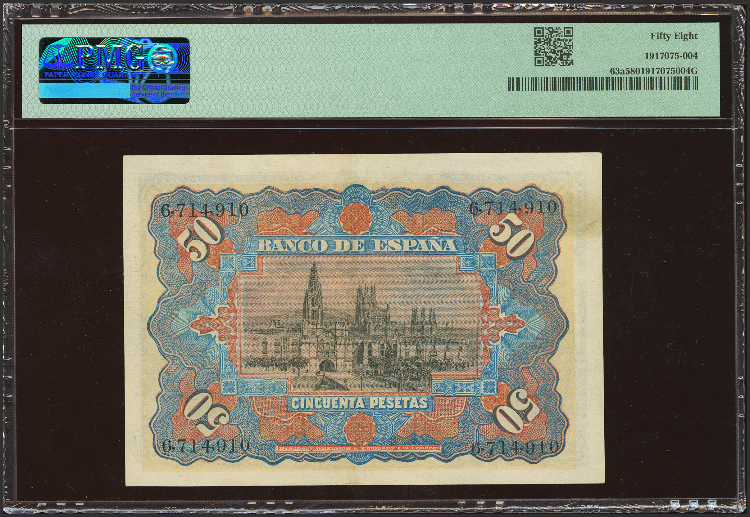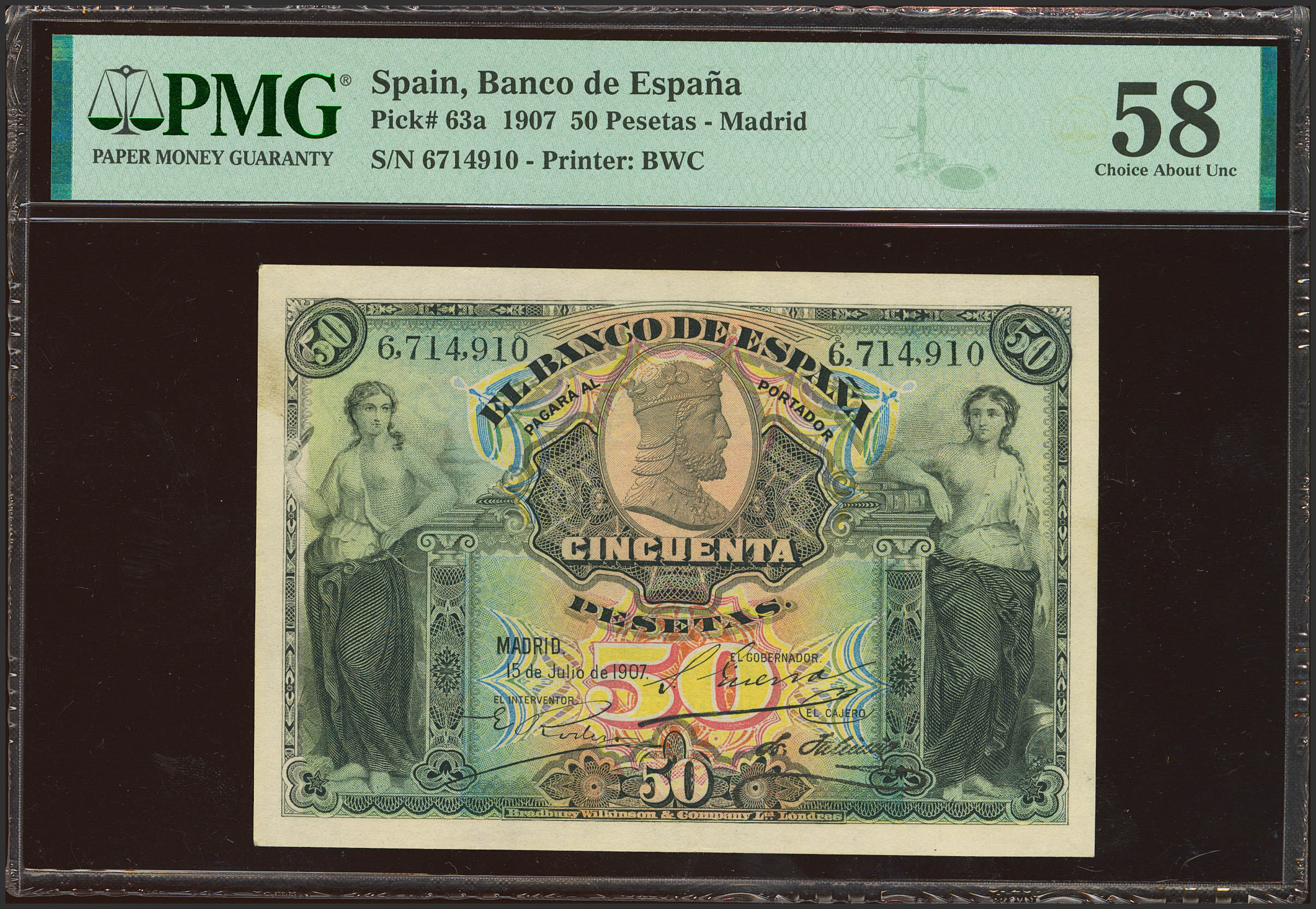 50 Pesetas. 15 de Julio de 1907. Sin serie. (Edifil 2023: 319, Pick: 63a). Raro en esta calidad. EBC++. Encapsulado PMG58. (para hacernos idea de la rareza, a fecha 1 de Marzo de 2024, este billete es el cuarto mejor calificado junto a otros nueve billetes en PMG)
