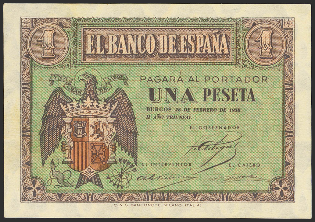 1 Peseta. 28 de Febrero de 1938. Serie B. (Edifil 2023: 427a). Conserva gran parte de su apresto original. EBC+++.