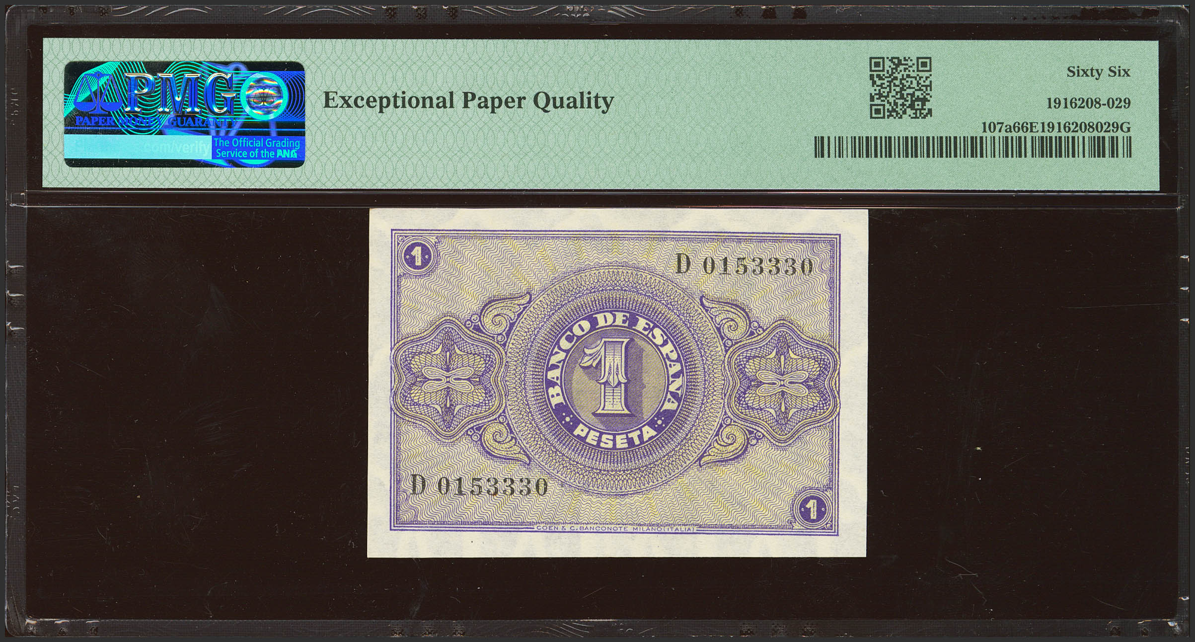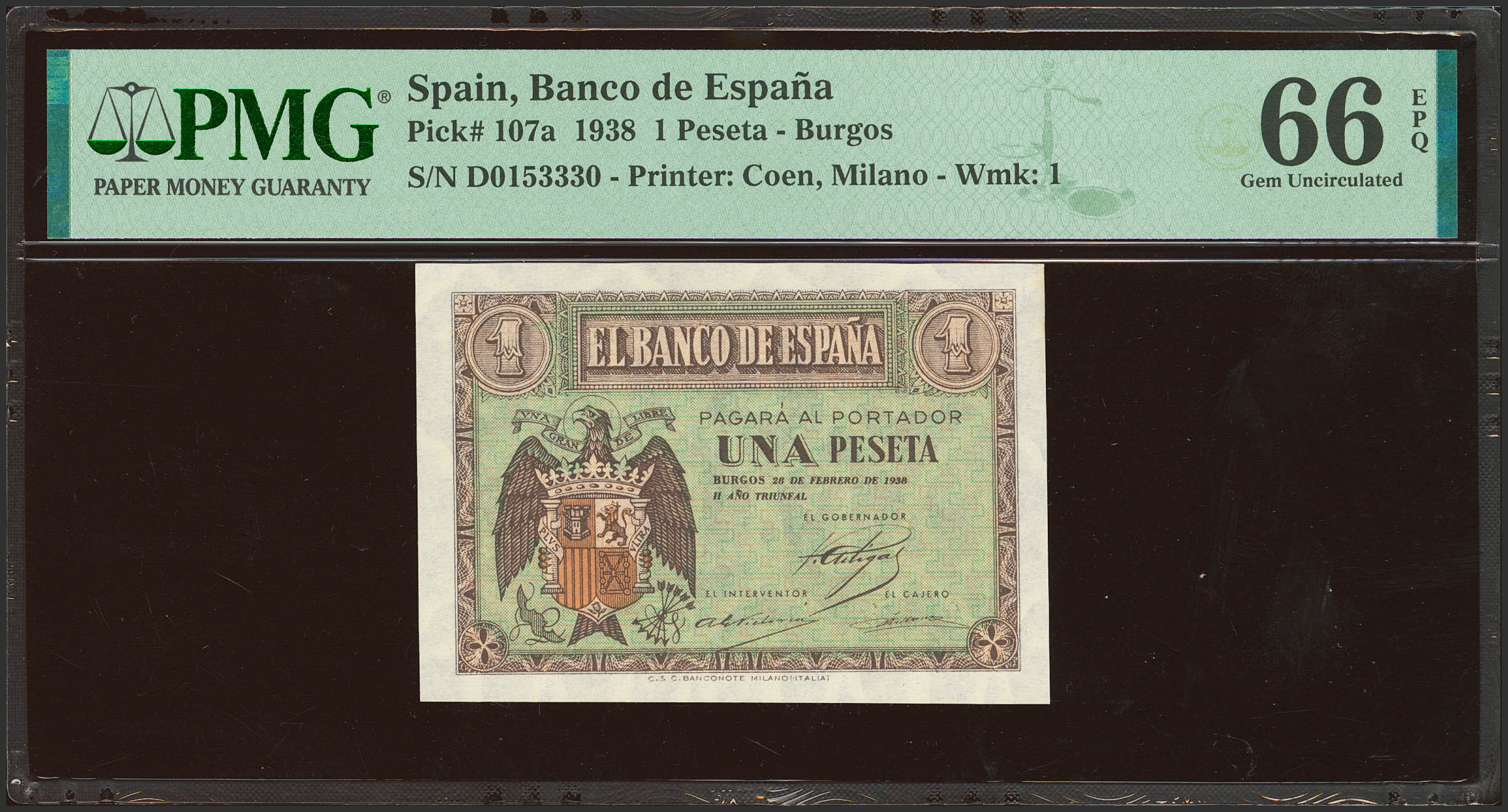 1 Peseta. 28 de Febrero de 1938. Serie D. (Edifil 2023: 427a, Pick: 107a). Apresto original. SC. Encapsulado PMG66EPQ.