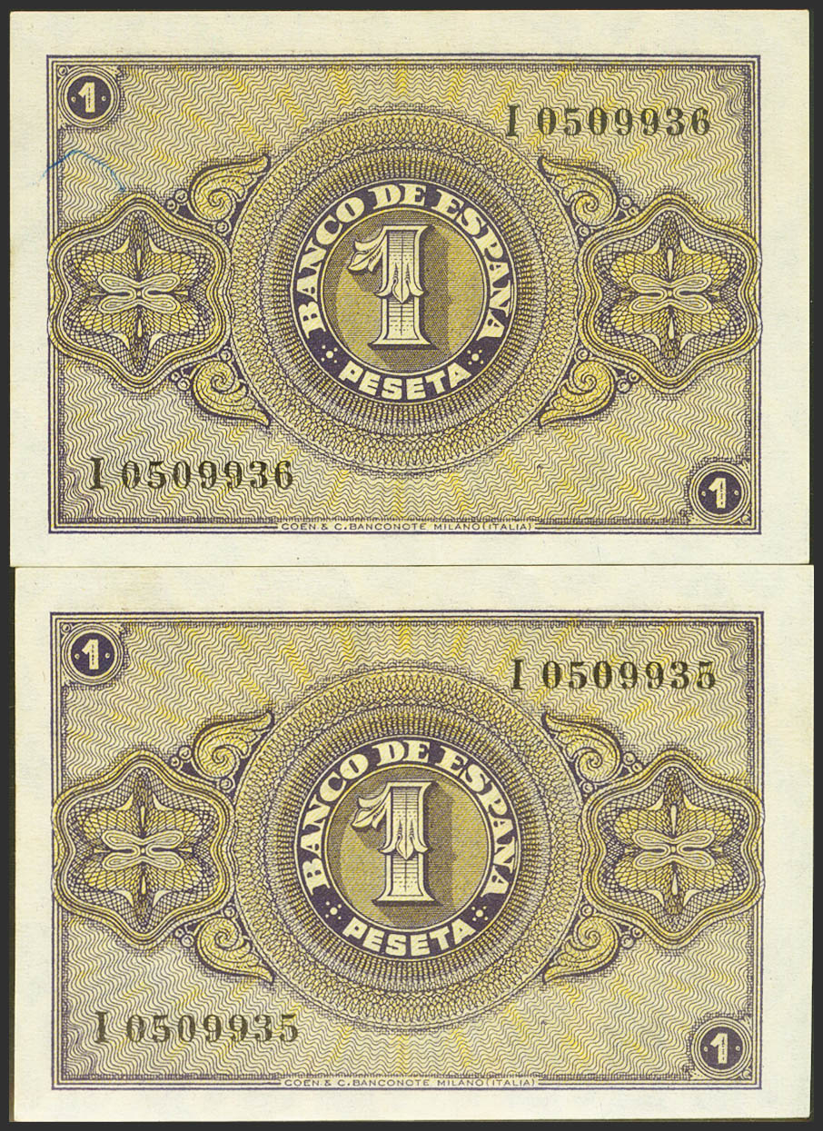1 Peseta. 30 de Abril de 1938. Pareja correlativa. Serie I. (Edifil 2021: 428a). Apresto original. EBC+++.